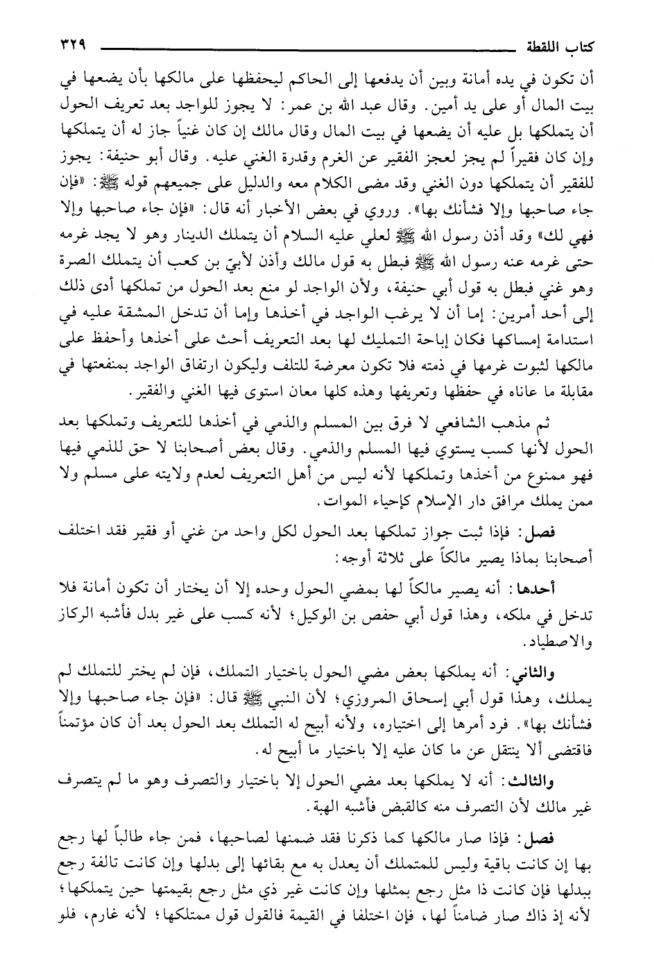 أن تكون في يده أمانة وبين أن يدفعها إلى الحاكم ليحفظها على مالكها بأن يضعها في بيت المال أو على يد أمين. وقال عبد الله بن عمر: لا يجوز للواجد بعد تعريف الحول أن يتملكها بل عليه أن يضعها في بيت المالك وقال مالك إن كان غنيًا جاز له أن يتملكها وإن كان فقيرًا لم يجز لعجز الفقير عن الغرم وقدرة الغني عليه. وقال أبو حنيفة: يجوز للفقير أن يتملكها دون الغني وقد مضى الكلام معه والدليل على جميعهم قوله صلى الله عليه وسلم: «فإن جاء صاحبها وإلا فشأنك بها».وروي في بعض الأخبار أنه قال: «فإن جاء صاحبها وإلا فهي لك» وقد أذن رسول الله صلى الله عليه وسلم لعلي عليه السلام أن يتملك الدينار وهو لا يجد غرمه حتى غرمه عنه رسول الله صلى الله عليه وسلم فبطل به قول مالك وأذن لأبيّ بن كعب أن يتملك الصرة وهو غني فبطل به قول أبي حنيفة، ولأن الواجد لو منع بعد الحول من تملكها أدى ذلك إلى أحد أمرين: إما أن لا يرغب الواجد في أخذها وإما أن تدخل المشقة عليه في استدامة إمساكها فكان إباحة التمليك لها بعد التعريف أحث على أخذها وأحفظ على مالكها لثبوت غرمها في ذمته فلا تكون معرضة للتلف وليكون ارتفاق الواجد بمنفعتها في مقابلة ما عاناه في حفظها وتعريفها وهذه كلها معان استوى فيها الغني والفقير.
