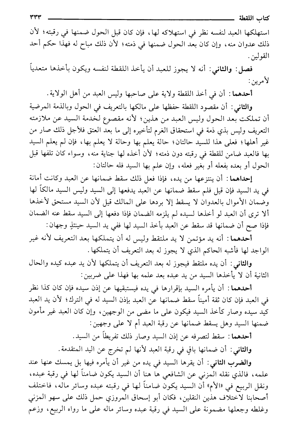 والثاني: أن يده ملتقط فيجوز له بعد التعريف أن يتملكها لأن يد عبده كيده والحال الثانية أن لا يأخذها السيد من يد عبده بعد علمه بها فهذا على ضربين: