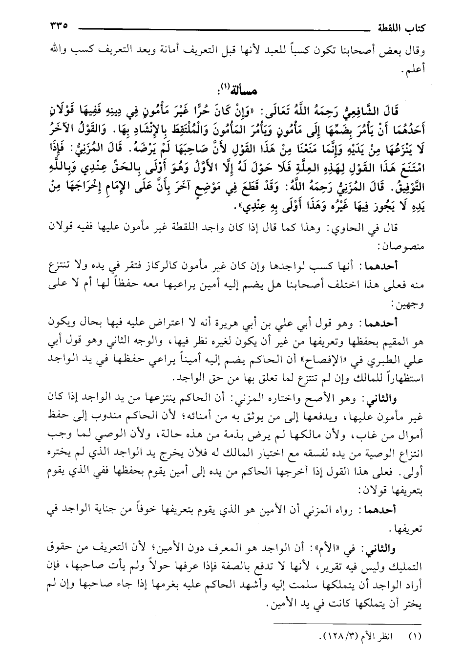 قَالَ الشَّافِعِيُّ رَحِمَهُ اللهُ تَعَالَى: «وَإِنْ كَانَ حُرًّا غَيْرَ مَامُونٍ في دِينِهِ فَفِيهَا قَوْلَانِ أحدهما أَنْ يَامُرَ بِضَمِّهَا إِلَى مَامُونٍ وَيَامُرَ المَامُونَ وَالْمُلْتَقِطَ بِالإِنْشَادِ بِهَا. وَالقَوْلُ الآخَرُ لَا يَنْزَعُها مِنْ يَدَيْهِ وَإِنَّمَا مَنَعْنَا مِنْ هّذَا القَوْلِ لأَنَّ صَاحِبَهَا لَمْ يَرْضَهُ. قَالَ المُزَنِيُّ: فَإِذَا امْتَنَعَ هَذَا القَوْلِ لِهَذِهِ العِلَّةِ فَلَا حَوْلَ لَهُ إِلَّا الأَوَّلُ وَهُوَ أَوْلَى بِالحَقِّ عِنْدِي وَباللهِ التَّوْفِيقُ. قَالَ المُزَنِيُّ رَحِمَهُ اللهُ: وَقَدْ قَطَعَ فِي مَوْضِعٍ آخَرَ بِأَنَّ عَلَى الإِمَامِ إِخْرَاجَهَا مِنْ يَدِهِ لَا يَجُوز فِيهَا غَيْرُه وَهَذَا أَوْلَى بِهِ عِنْدِي».