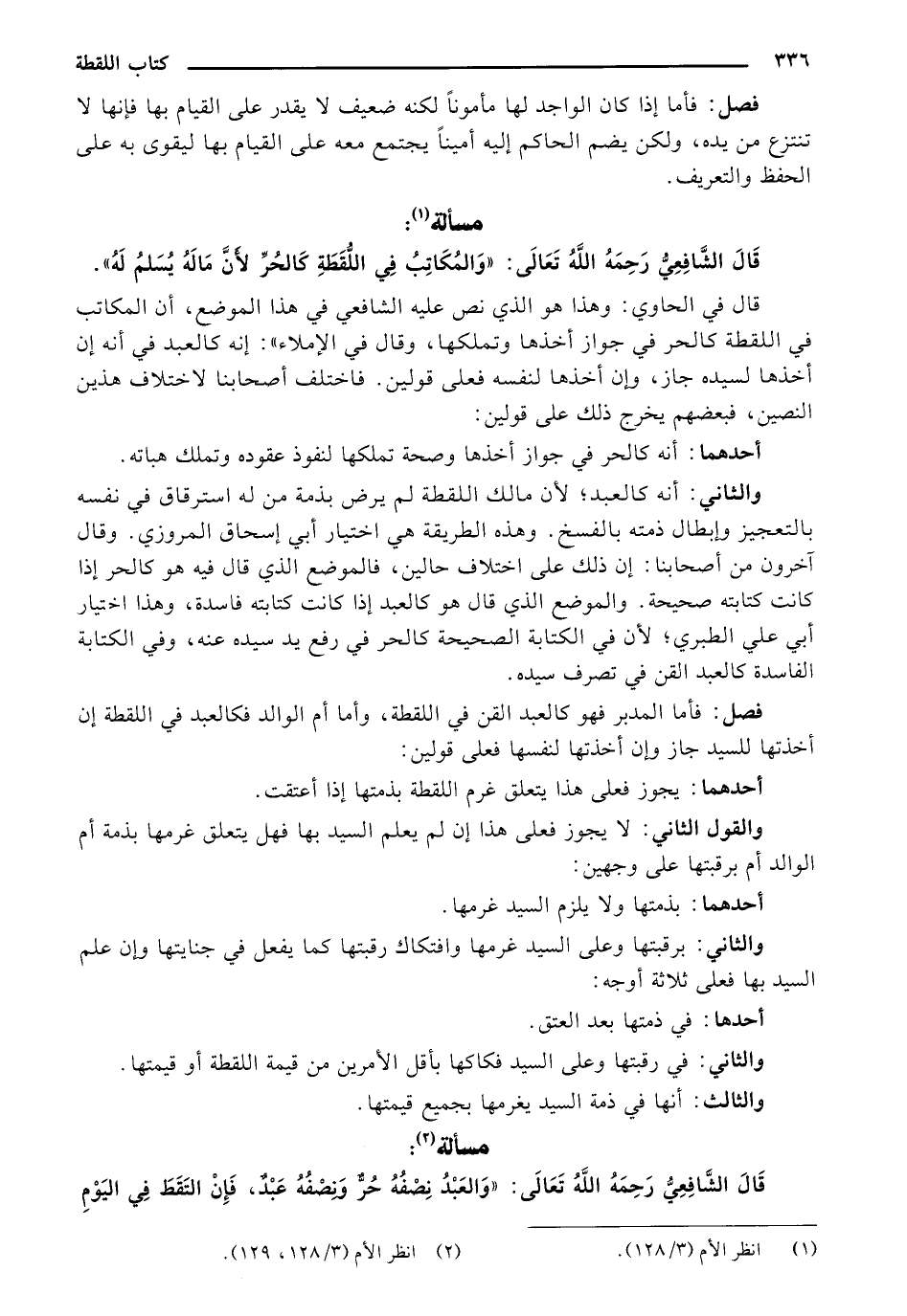 قال في الحاوي: وهذا هو الذي نص عليه الشافعي في هذا الموضوع، أن المكاتب في اللقطة كالحر في جواز أخذها وتملكها، وقال في «الإملاء»: إنه كالعبد في أنه إن أخذها لسيده جاز، وإن أخذها لنفسه فعلى قولين. فاختلف أصحابنا لاختلاف هذين النصين، فبعضهم يخرج ذلك على قولين: