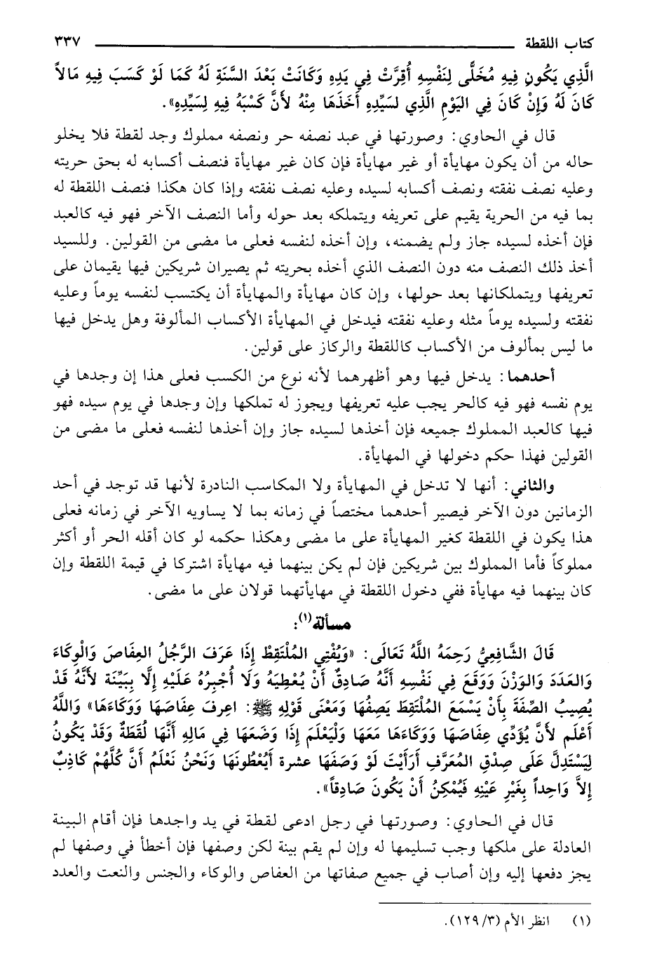 والثاني: أنها لا تدخل في المهايأة ولا المكاسب النادرة لنها قد توجد في أحد الزمانين دون الأخر فيصير أحدهما مختصًا في زمانه بما لا يساويه الآخر في زمانه فعلى هذا يكون في اللقطة كغير المهايأة على ما مضى وهكذا حكمه لو كان أقله الحر أو أكثر مملوكًا فأما المملوك بين شريكين فإن لم يكن بينهما فيه مهايأة اشتركا في قيمة اللقطة وإن كان بينهما فيه مهايأة ففي دخول اللقطة في مهايأتهما قولان على ما مضى.