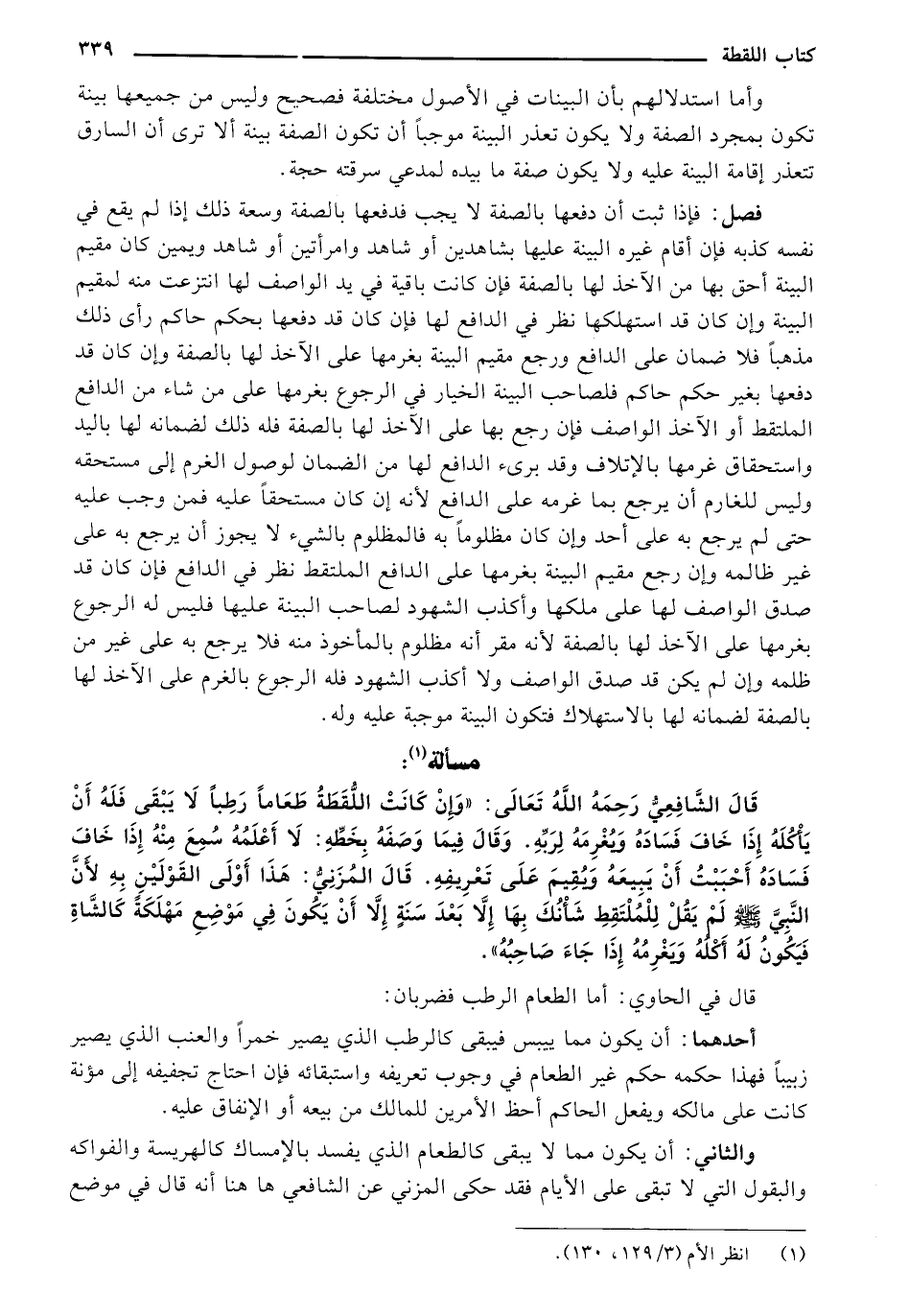 قَالَ الشَّافِعِيُّ رَحِمَهُ اللهُ تَعَالَى: «وَإِنْ كَانَتْ اللَّقَطَةُ طَعَامًا رَطِبًا لَا يَبْقَى فَلَهُ أَنْ يَاكُلَهُ إِذَا خَافَ فَسَادَهُ وَيُغْرِمَهُ لِرَبِّهِ. وَقَالَ فِيمَا وَصَفَهُ بِخَطِّهِ: لَا أَعْلَمُهُ سُمِعَ مِنْهُ إِذَا خَافَ فَسَادَهُ أَحْبَبْتُ أَنْ يَبِيعَهُ وَيُقِيمَ عَلَى تَعْرِيفِهِ. قَالَ المُزَنِيُّ: هَذاَ أَوْلَى القَوْلَيْنِ بِهِ لأَنَّ النَّبِيِّ صلى الله عليه وسلم لَمْ يَقُلْ لِلْمُلْتَقِطِ شَانُكَ بِهَا إِلَّا بَعْدَ سَنَةٍ أَنْ يَكُونَ فِي مَوْضِعِ مَهْلَكَةً كَالشَّاةِ فَيَكُونُ لَهُ أَكْلُهُ وَيَغْرِمُهُ إِذا جَاءَ صَاحِبُهُ».