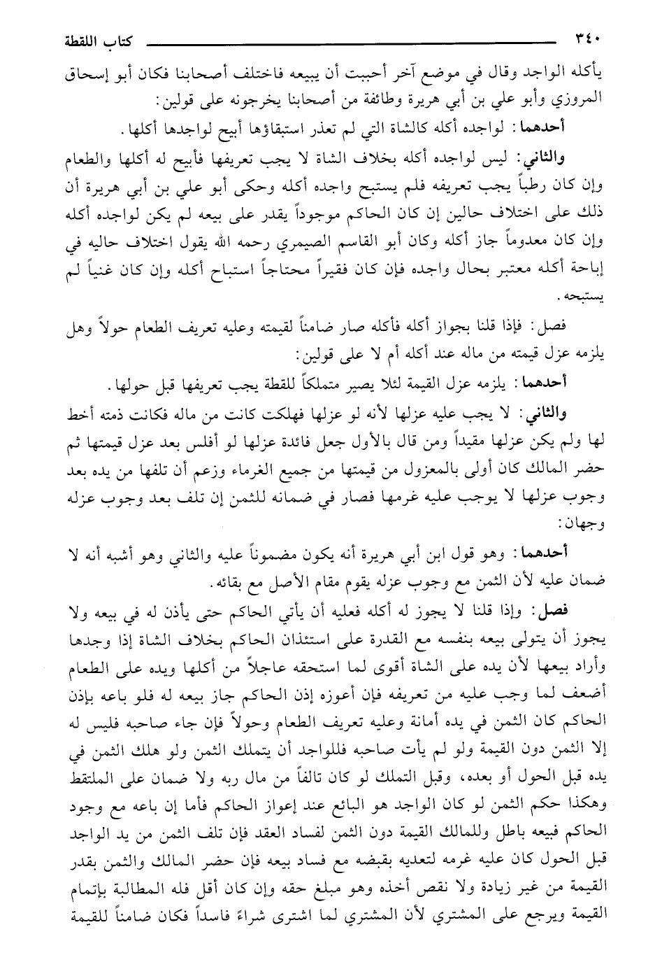 والثاني: ليس لواجده أكله بخلاف الشاه لا يجب تعريفها فأبيح له أكلها والطعام وإن كان رطبًا يجب تعريفه فلم يستبح واجده أكله وحكي أبو علي بن أبي هريرة أن ذلك على اختلاف حالين إن كان الحاكم موجودًا يقدر على بيعه لم يكن لواجده أكله وإن كان معدومًا جاز أكله وكان أبو القاسم الصيمري رحمه الله يقول اختلاف حاليه في إباحة أكله معتبر بحال واجده فإن كان فقيرًا محتاجًا استباح أكله وإن كان غنيًا لم يستبحه.