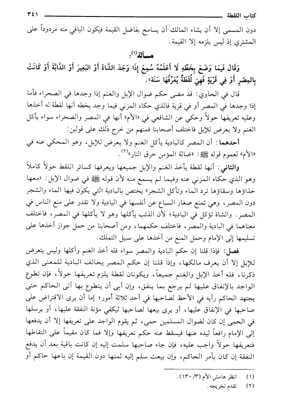 الثاني: أنها لقطة يأخذ الغنم والإبل جميعها ويعرفها كسائر اللقط حولًا كاملًا وهو للذي حكاه المزني عنه وفيما لم يسمع منه لأن قوله صلى الله عليه وسلم في ضوال الإبل: "معها حذاؤها وسقاؤها ترد الماء وتأكل الشجر" يختص بالبادية التي يكون فيها الماء والشجر دون المصر وهي تمنع، صغار السباع عن أنفسها في البادية ولا تقدر على مع الناس في المصر. والشاة تؤكل في البادية؛ لأن الذئب يأكلها وهو لا يأكلها في المصر، فاختلف معناهما في البادية والمصر، فاختلف حكمهما، ومن أصحابنا من حمل جواز أخذها على تسليمها إلى الإمام وحمل المنع من أخذها على سبيل التملك.