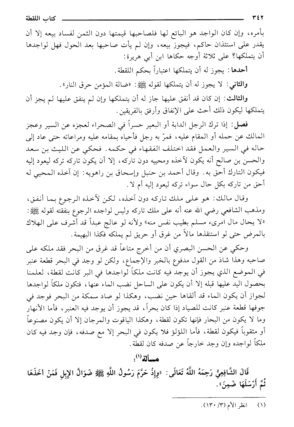 قال الشافعي رحمه الله تعالى: "وإذ حرم رسول الله صلى الله عليه وسلم ضوال الإبل فمن أخذها ثم أرسلها ضمن".