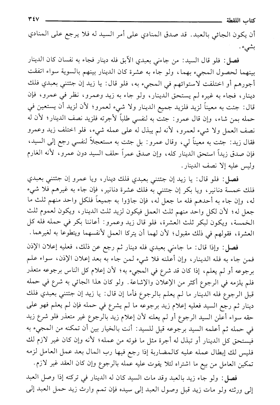 فصل: وإذا قال: ما جاءني بعبدي فله دينار ثم رجع عن ذلك، فعليه إعلان الإذن فمن جاء به فله الدينار وإن أعلنه فلا شيء لمن جاء به بعد إعلان الإذن، سواء علم برجوعه أو لم يعلم، إذا كان قد شرع في المجيء به؛ لأن إعلام كل الناس برجوعه متعذر فلم يلزمه في الرجوع أكثر من الإعلان والإشاعة. ولو كان هذا الجائي به شرع في حمله قبل الرجوع فله الدينار ما لم يعلم بالرجوع فأما إن قال: يا زيد إن جئتني بعيدي فلك دينار ثم رجع السيد فعليه إعلام زيد برجوعه ما لم يشرع في حمله فإن لم يعلم فهو على حقه سواء أعلن السيد الرجوع أو لم يعلنه لأن إعلام زيد بالرجوع غير متعذر فلو شرع زيد في حمله ثم أعلمه السيد برجوعه قيل للسيد: أنت بالخيار بين أن تمكنه من المجيء به فيستحق كل الدينار أو تبذل له أجرة مثل ما قوته من عمله؛ لأنه وإن كان غير لازم لك فليس لك إبطال عمله عليه كالمضاربة إذا رجع فيها رب المال بعد عمل العامل لزمه تمكين العامل من بع ما اشتراه لئلا يفوت عليه عمله بالرجوع وإن كان العقد غير لازم.