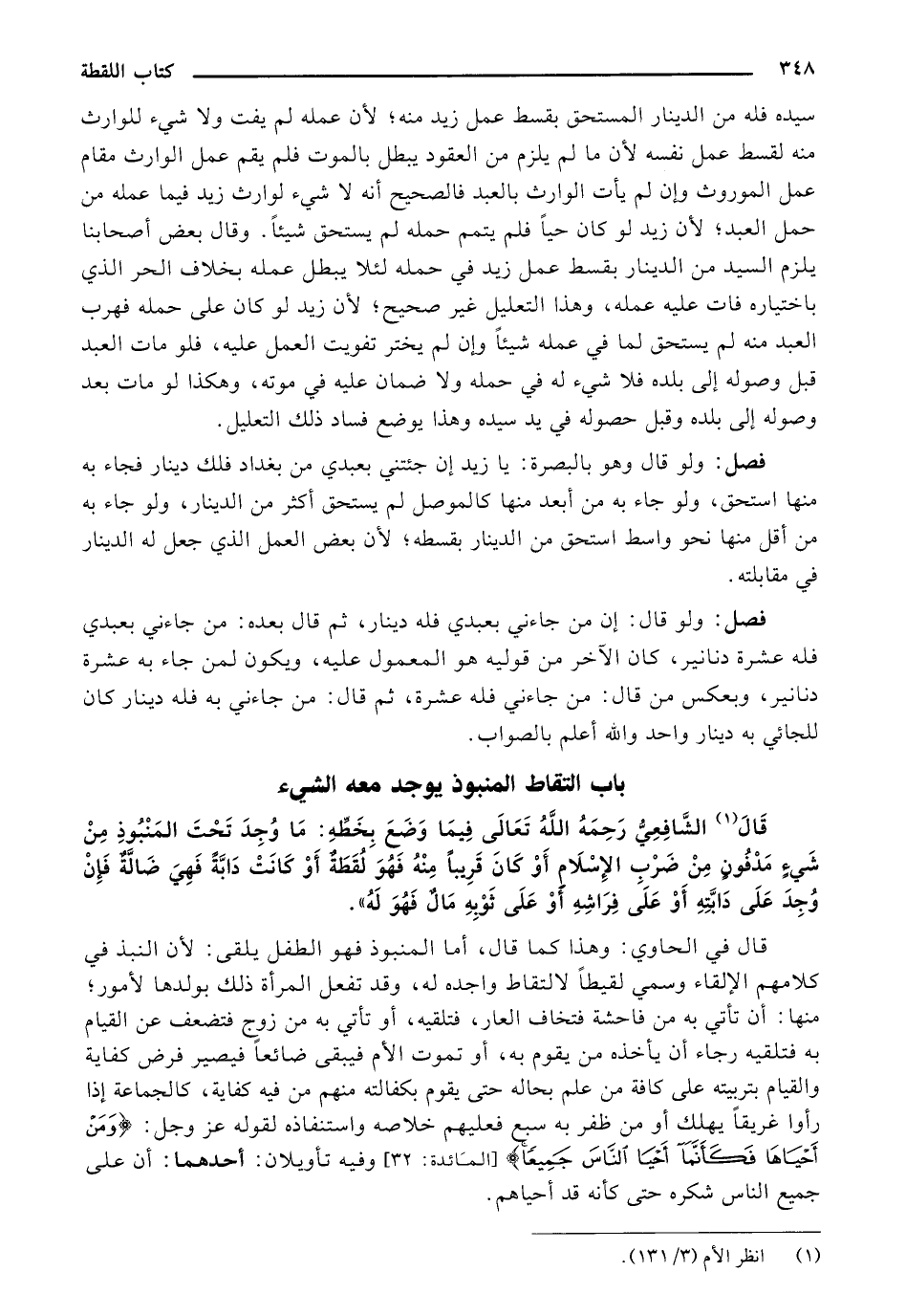 قال الشافعي رحمه الله تعالي فيما وضع بخطه: ما وجد تحت منبوذ شيء مدفون من ضرب الإسلام أو كان قريبًا منه فهو لقطة أو كانت دابة فهي ضالة فإن وجد على دابته أو على فراشه أو على ثوبه مال فهو له".