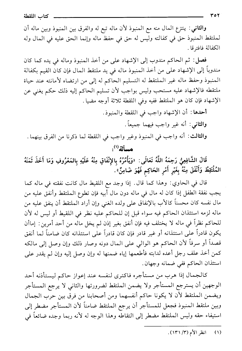 فصل: ثم الحاكم مندوب إلى الإشهاد على من أخذ المنبوذ وماله في يده كما كان مندوبًا إلى الإشهاد على من أخذ المنبوذ ماله في يد ملتقط المال فإن كان القيم بكفالة المنبوذ وحفظ ماله غير الملتقط له التسليم الحاكم له إلى من ارتضاه لأمانته عند حياة ملتقطه فالإشهاد عليه مستحب وليس بواجب لأن تسليم الحاكم إليه ذلك حكم يغني عن الإشهاد فإن كان هو الملتقط ففيه وفي اللقطة ثلاثة أوجه مضيا.