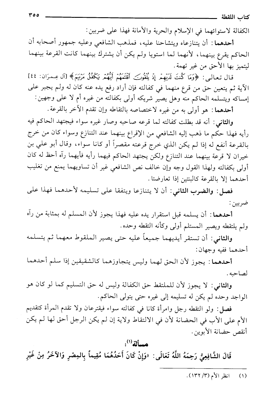 قال تعالى: {ومَا كُنتَ لَدَيْهِمْ إذْ يُلْقُونَ أَقْلامَهُمْ أَيُّهُمْ يَكْفُلُ مَرْيَمَ} [آل عمران: 44] الآية ثم يتعين حق من قرع منهما في كفالته قان أراد رفع يده عنه كان له ولم يجبر على إمساكه ويتسلمه الحاكم منه وهل يصير شريكه أولى بكفالته من غيره أم لا على وجهين: