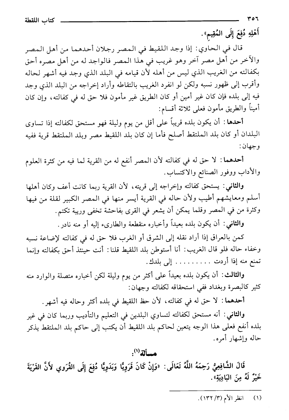 والثاني: يستحق كفالته وإخراجه إلى قريته، لأن القرية ريما كانت أعف وكان أهلها أسلم ومعايشهم أطيب ولأن حاله في القرية أيسر منها في المصر الكبير لقلة من فيها وكثرة من ني المصر وقلما يمكن أن يشعر ني للقرى بفاحشة تخفى وريبة تكتم.