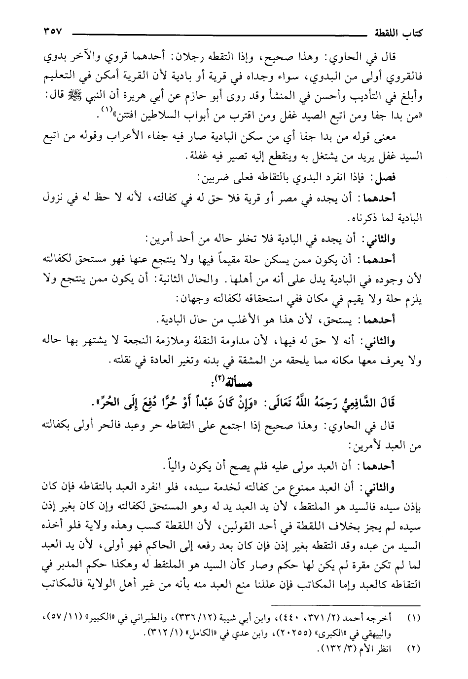 قال في الحاوي: وهذا صحيح إذا اجتمع على التقاطه حر وعبد فالحر أولى بكفالته من العيد لأمرين: