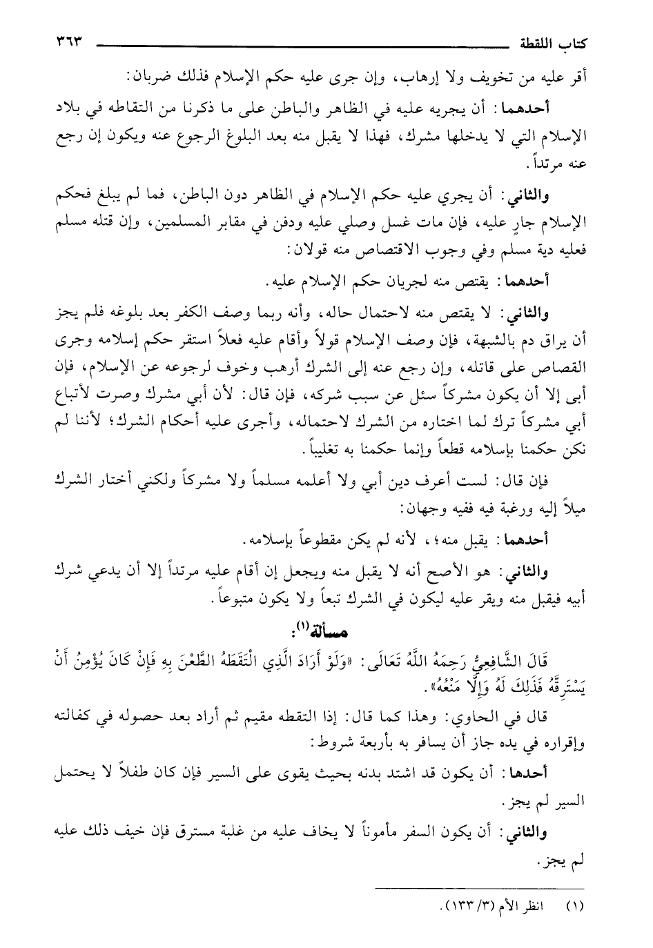 والثاني: لا يقتص منه لاحتمال حاله، وأنه ربما وصف الكفر بعد بلوغه فلم يجز أن يراق دم بالشبهة، فإن وصف الإسلام قولًا وأقام عليه فعلًا استقر حكم إسلامه وجرى القصاص على قاتله، وإن رجع عنه إلى الشرك أرهب وخوف لرجوع عن الإسلام، فإن أبى إلا أن يكون مشركًا سئل عن سبب شركه، فإن قال: لأن أبي مشرك وصرت لأتباع أبي مشركًا ترك لما اختاره من الشرك لاحتماله، وأجرى عليه أحكام الشرك؛ لأننا لم نكن حكمنا بإسلامه قطعًا وإنما حكمنا به تغليبًا.