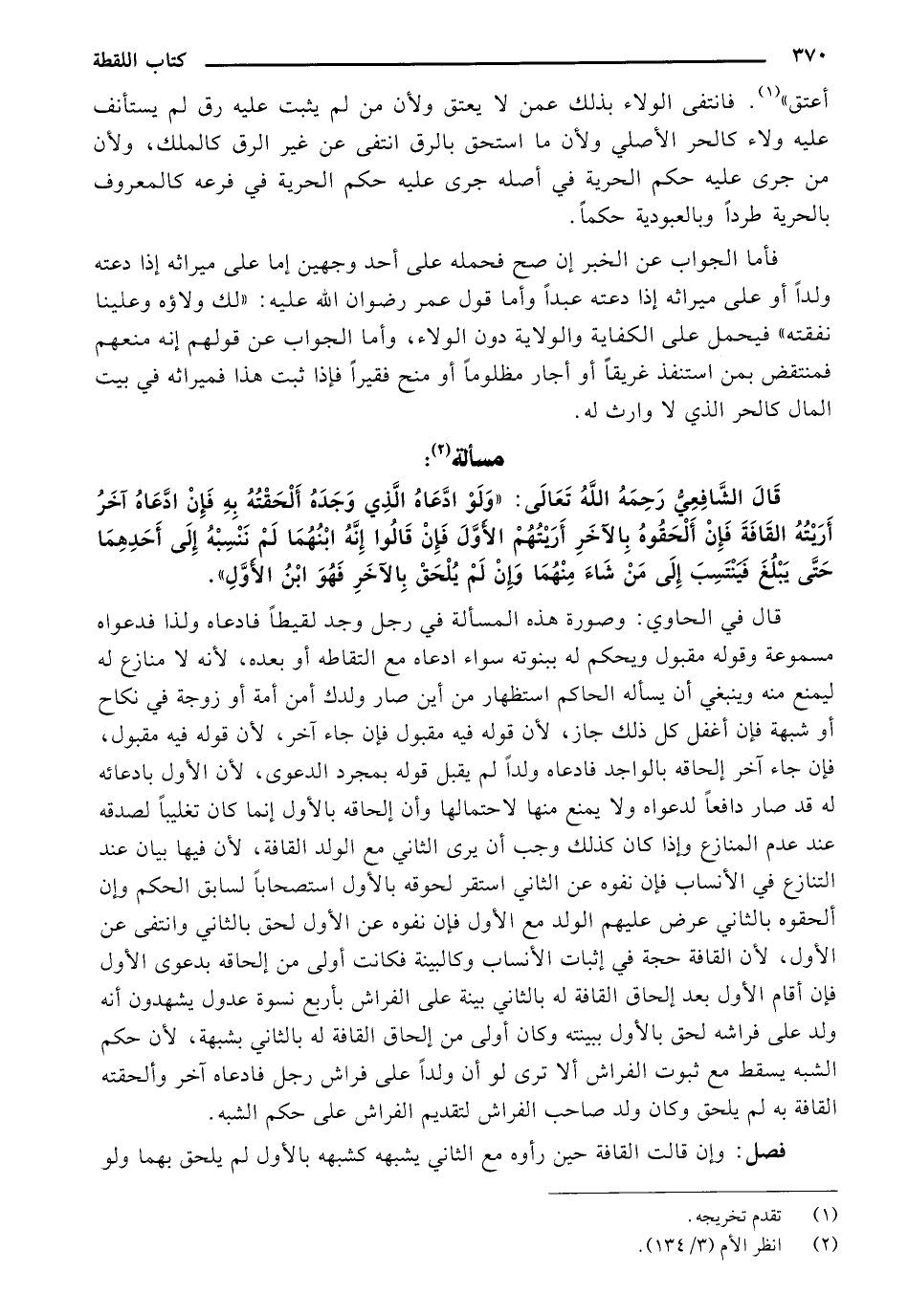 قال الشافعي رحمه الله عليه: "ولو ادعاء الذي وجده ألحقته به فإن ادعاه آخر أريته القافة فإن ألحقوه بالآخر أريتهم الأول فإن قالوا إنه ابنهما لم ننسبه إلى أحدهما حتى يبلغ فينتسب إلى من شاء منهما وإن لم يلحق بالآخر فهو ابن الأول".
