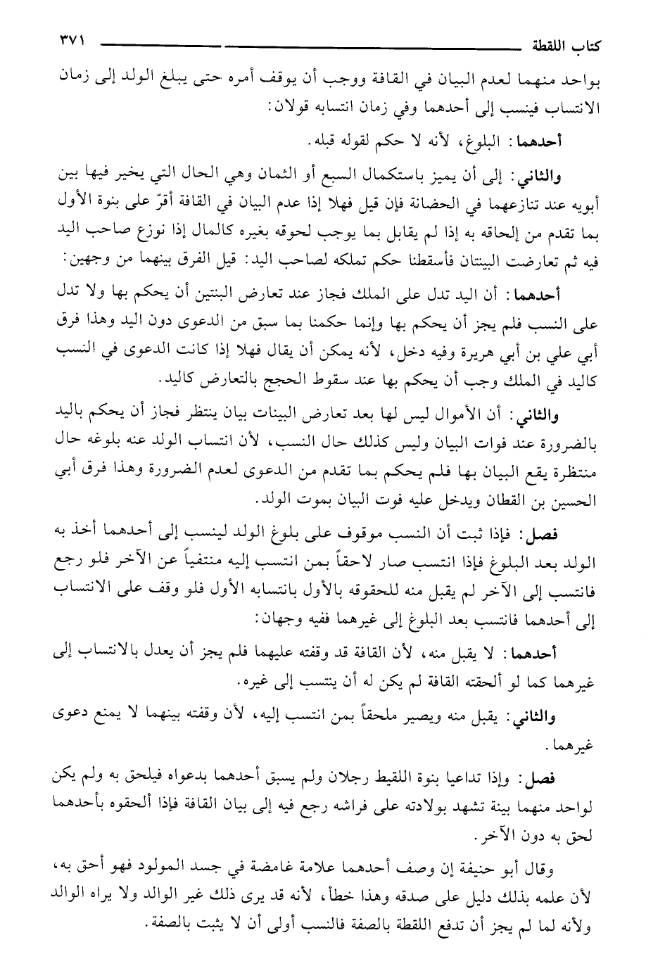 والثاني: أن الأموال ليس لها بعد تعارض البينات بيان ينتظر فجاز أن يحكم باليد بالضرورة عند فوات البيان وليس كذلك حال النسب، لأن انتساب الولد عنه بلوغه حال منتظرة يقع البيان بها فلم يحكم بما تقدم من الدعوى لعدم الضرورة وهذا فرق أبي الحسين بن القطان ويدخل عليه فوت البيان بموت الولد.