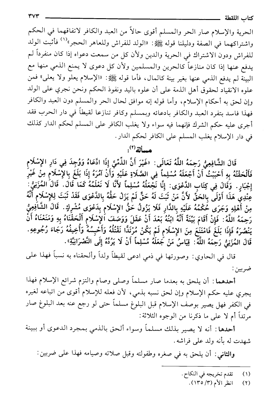 الحرية والإسلام صار الحر والمسلم أقوى حالاً من العبد والكافر لاتفاقهما في الحكم واشتراكهما في الصفة ودليلنا قوله صلى الله عليه وسلم: "الولد للفراش وللعاهر الحجر "فأثبت الولد للفراش ودون الاشتراك في الحرية والدين ولأن كل من سمعت دعواه إذا كان منفردًا لم يدفع عنها إذا كان منازعًا كالحرين والمسلمين ولأن كل دعوى لا يمنع الذمي منها مع البينة لم يدفع عنها بغير بينة كالمال، فأما قوله صلى الله عليه وسلم: "الإسلام يعلو ولا يعلى "فمن علوه الانقياد لحقوق أهل الذمة على أن علوه باليد ونفوذ الحكم ونحن نجري على الولد وإن لحق به أحكام الإسلام، وأما قوله إنه موافق لحال الحر والمسلم دون العبد والكافر فهذا فاسد بتفرد العبد والكافر بادعائه وبمسلم وكافر تنازعا لقيطًا في دار الحرب فقد أجرى عليه حكم الشرك فإنهما فيه سواء ولا يغلب الكافر على المسلم لحكم الدار كذلك في دار الإسلام يغلب المسلم على الكافر لحكم الدار.