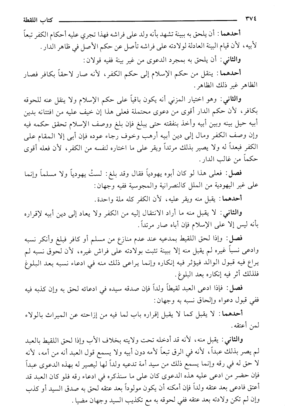 أحدهما: أن يلحق به ببينه تشهد بأنه ولد على فراشه فهذا تجري عليه أحكام الكفر تبعًا لبيه، لأن قيام البينة العادلة لولادته على فراشه تأصل عن حكم الأصل في ظاهر الدار.
