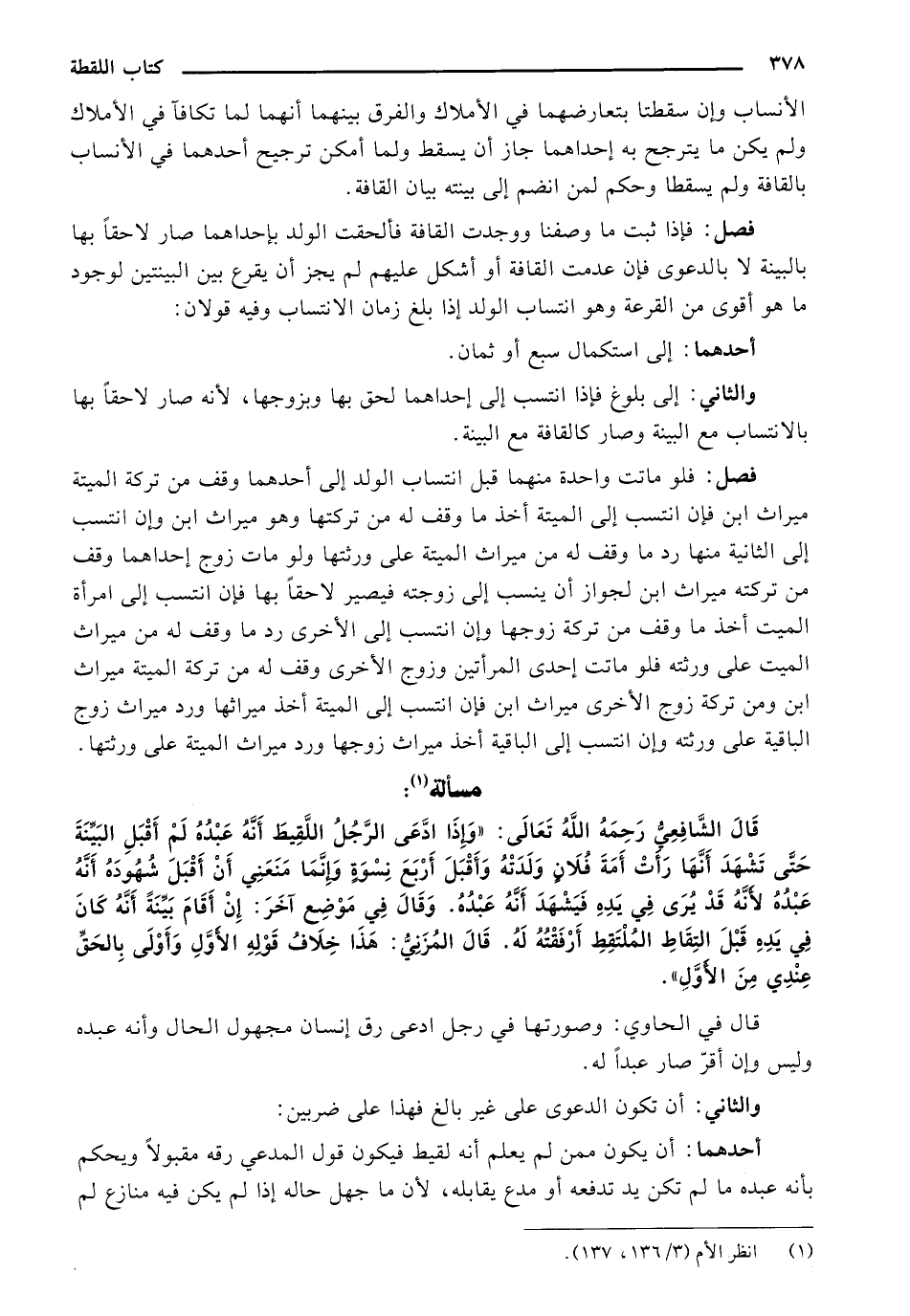 قَالَ الشَّافِعِيُّ رَحِمَهُ اللهُ تَعَالَى: "وَإِذَا ادَّعَى الرَّجُلُ اللَّقِيطَ أَنَّهُ عَبْدُهُ لَمْ أَقْبَلِ البَيَّنّةَ حَتَّى تَشْهَدَ أَنَّهَا رَأَتْ أَمَةَ فُلاَنٍ وَلَدَتْهُ وَأَقْبَلَ نِسْوَةِ وَإِنَّمَا مَنَعَنِي أَنْ أَقْبَلَ شُهُودَهُ أَنَّهُ عَبْدُهُ لأَنَّهُ قّدْ يُرَى فِي فَيَشْهَدَ أَنَّهُ عَبْدُهُ. وَقَالَ فِي مَوْضِع آخَرَ: إنْ أَقَامَ بَيَّنَةَ أَنَّهُ كَانَ فِي يَدِهِ قَبْلَ التِقَاطِ المُلْتَقِطِ لَهُ. قَالَ المُزَنِيُّ: هَذَا خِلاَفُ قَوْلِهِ الأَوَّلِ وَأَوْلَى بِالحَقِّ عِنْدِيِ مِنَ الأَوَّلِ ".