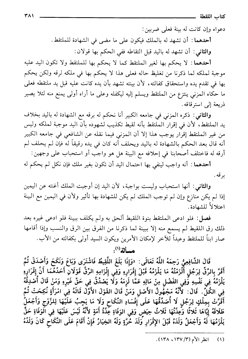 قَالَ الشَّافِعيُّ رَحمَهُ اللهُ تَعَالَى: "وَإذَا بَلَغَ اللَّقيطُ فَاشْتَرَى وَبَاعَ وَنَكَحَ وَأَصْدَقَ ثُمِّ أَقَرَّ بالرّقِّ لِرَجُلِ أَلْزَمْتُهُ مَا يَلْزَمُهُ قَبْلَ إِقْرَارِهِ وَفِي إِلْزَامِهِ الرّقِّ قَوْلاَنِ أحدهما أَنََّ إِقْرَارِهِ يَلْزَمُه ُفِي نَفْسِهِ وَفِي الفَضْلِ مِنْ مَالهِ عَمَّا لَزِمَهُ وَلاَ يَصْدُقُ َفِي حَقِّ غَيْرِهِ وَمِنْ قَالََ أَصْدَقَهُ فِي الكُلِّ. قَالَ: لأَنَّهُ مَجْهُولُ الأَصْلِ وَمِنْ قَالََ القَوْلَ الأَوَّلَ قَالَهُ فِي امْرَأَةٍ نُكحتْ ثُمَّ أَقَرَّتْ بِمِلْك لِرَجُلٍ لاَ أُصَدِّقُهَا عَلَى إفْسَادِ النِّكَاح وَلاَ مَا يَجبُ عَلَيْهَا للِزَّوْجِ وَأَجْعَلُ طَلاَقَهُ إيَّاهَا ثَلاثَا وَعِدَّتُهَا ثَلاثُ حِيَضٍ وَفِي الوَفَاةِ عِدَّةُ أَمَةٍ لأَنَّهُ لَيْسَ عَلَيْهَا َفِي الوَفَاةِ حَقِّ يَلْزَمُهَا لَهُ وَأَجْعَلُ وَلَدَهُ قَبْلَ الإقْرَارِ وَلَدَ حُرَّةٍ وَلَهُ الخِيَارُ فَإنْ أَقَامَ عَلَى النْكَاحِ كَانَ وَلَدُهُ