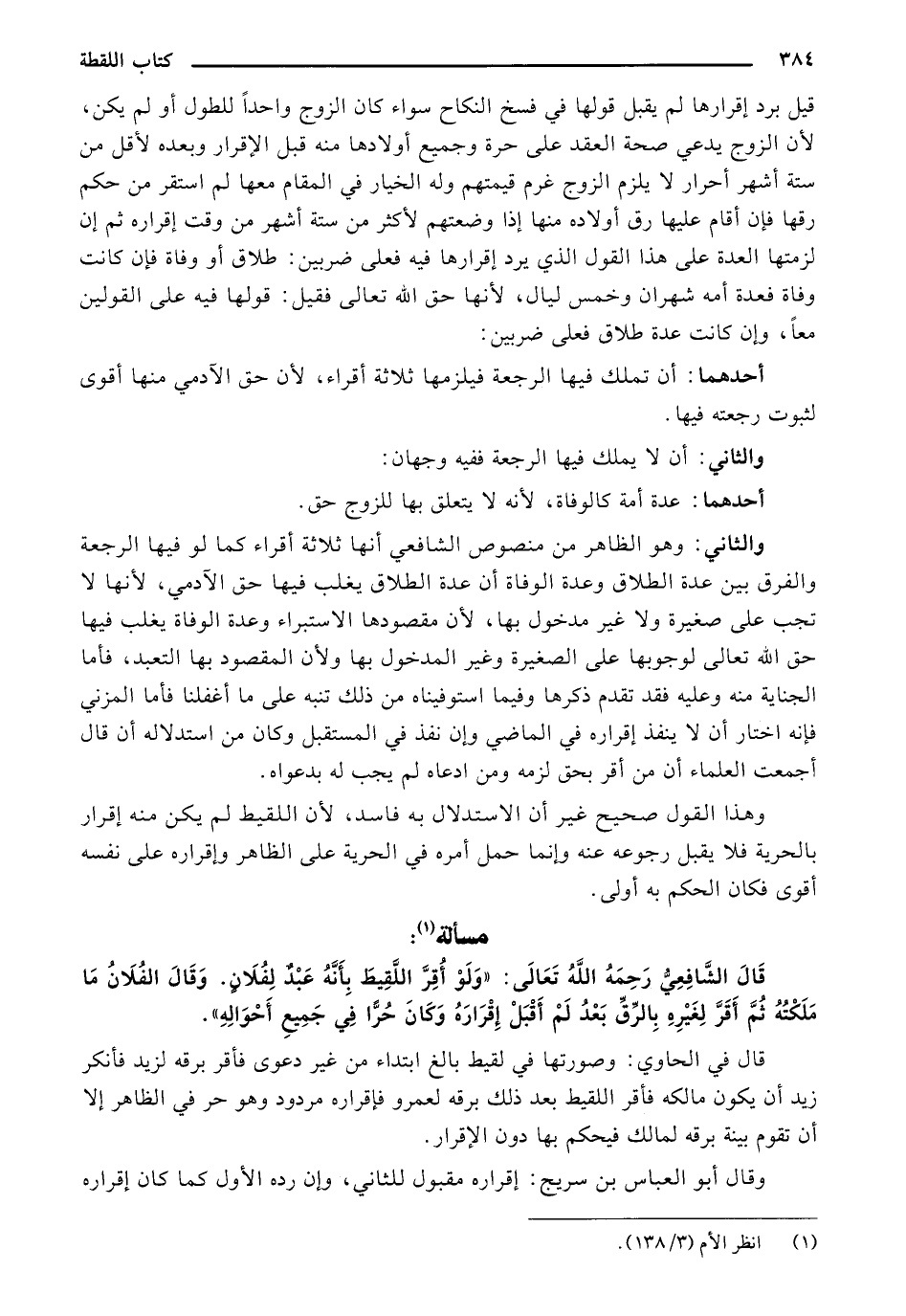 والثاني: وهو الظاهر من منصوص الشافعي أنها ثلاثة اقراء كما لو فيها الرجعة والفرق بين عدة الطلاق وعدة الوفاة أن عدة الطلاق يغلب فيها حق الادمي، لأنها لا تجب على ضغيرة ولا غير مدخول بها، لأن مقصودها الإستبراء وعدة الوفاة يغلب فيها حق الله تعالى لوجوبها على الضغيرة وغير المدخول بها ولأن المقصود بها التعبد، فأما الجناية منه وعليه فقد تقدم ذكرها وفيما استوفيناه من ذلك تنبيه على ما أغفلنا فأما المزني فإنه اختار أن لا ينفذ إقراره في الماضي وإن نفذ في المستقبل وكان من استدلاله أن قال أجمعت العلماء أن من أقر بحق لزمه ومن ادعاه لم يجب ل بدعواه.