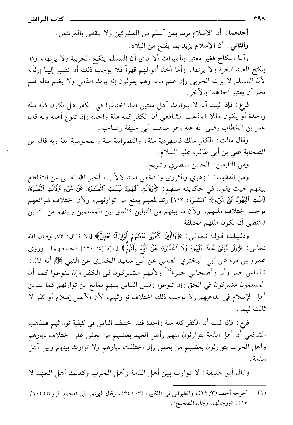 ودليلنا قوله تعالى: {والَّذِينَ كَفَرُوا بَعْضُهُمْ أَوْلِيَاءُ بَعْضٍ} [الأنفال: 73] وقال الله تعالى: "ولَن تَرْضَى عَنكَ اليَهُودُ ولا النَّصَارَى حَتَّى تَتَّبِعَ مِلَّتَهُمْ" [البقرة: 120] فجمعهما. وروي عمرو بن مرة عن أبي البختري الطائي عن أبي سعيد الخدري عن النبي صلى الله عليه وسلم أنه قال: "الناس خير وأنا وأصحابي خير" ولأنهم مشتركون في الكفر وإن تنوعوا كما أن المسلمون مشتركون في الحق وإن تنوعوا وليس التباين بينهم بمانع من توارثهم كما يتباين أهل الإسلام في مذاهبهم ولا يوجب ذلك اختلاف توارثهم، لأن الأصل إسلام أو كفر لا ثالث لهما.
