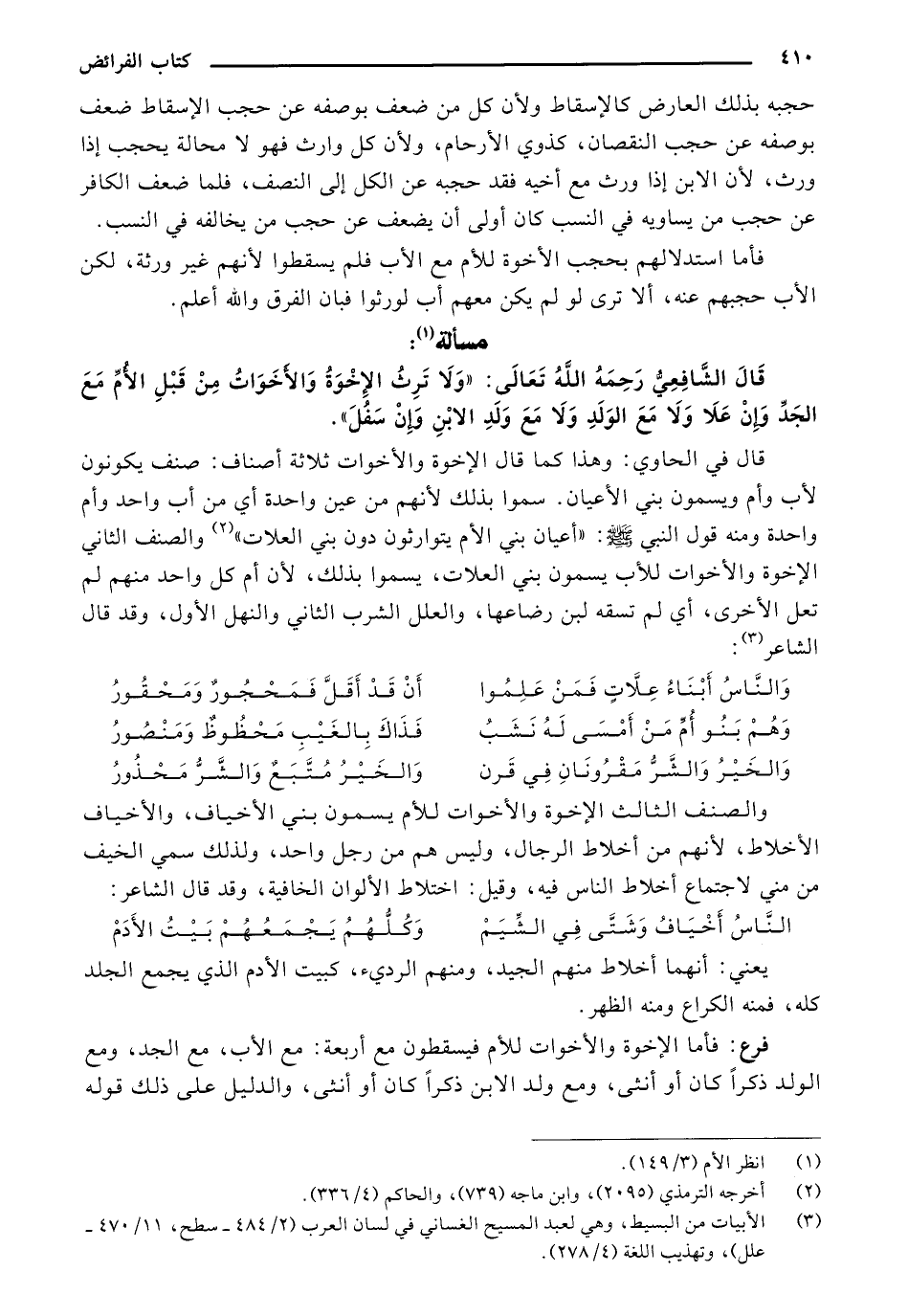 قَالَ الشَّافِعِيُّ رَحِمَهُ اللهُ تَعَالَى: "وَلَا تَرِثُ الإِخْوَةُ وَالأَخَوَاتُ مِنْ قَبْلِ الأُمِّ مَعَ الجَدِّ وَإِنُ عَلَا وَلَا مَعَ الوَلَدِ وَلَا مَعَ وَلَدِ الابْنِ وَإِنْ سَفُلَ".