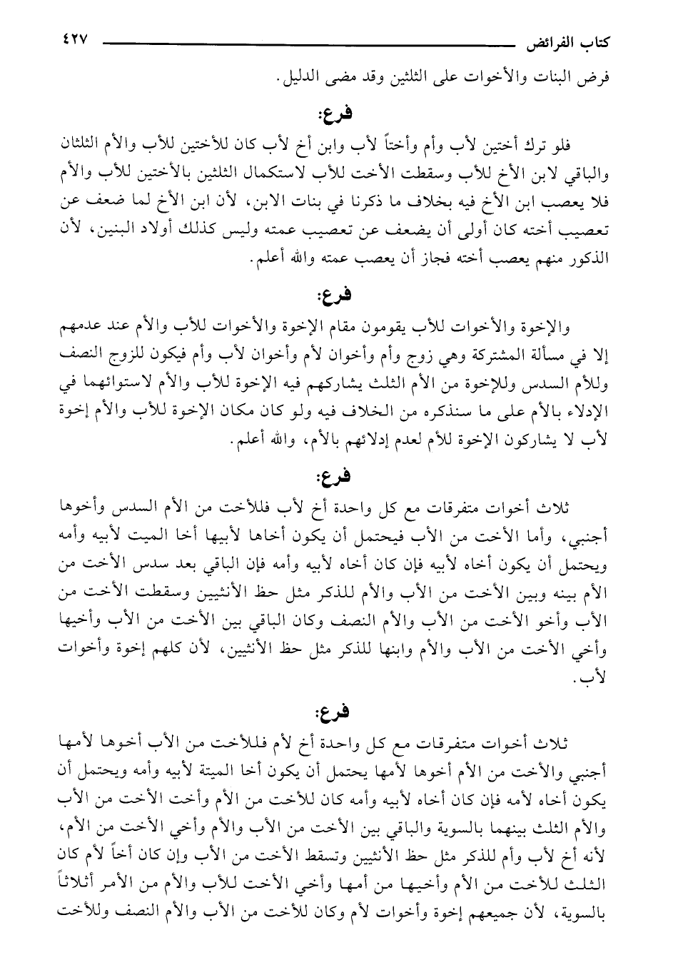 فلو ترك أختين لأب وأم وأختًا لأب وابن أخ لأب كان للأختين للأب والأم الثلثان والباقي لابن الأخ للأب وسقطت الأخت للأب لاستكمال الثلثين الأختين للأب والأم فلا يعصب ابن الأخ فيه بخلاف ما ذكرنا في بنات الابن، لأن ابن الأخ لما ضعف عن تعصيب أخته كان أولى أن يضعف عن تعصيب عمته وليس كذلك أولاد البنين، لأن الذكور منهم يعصب أخته فجاز أن يعصب عمته والله أعلم.