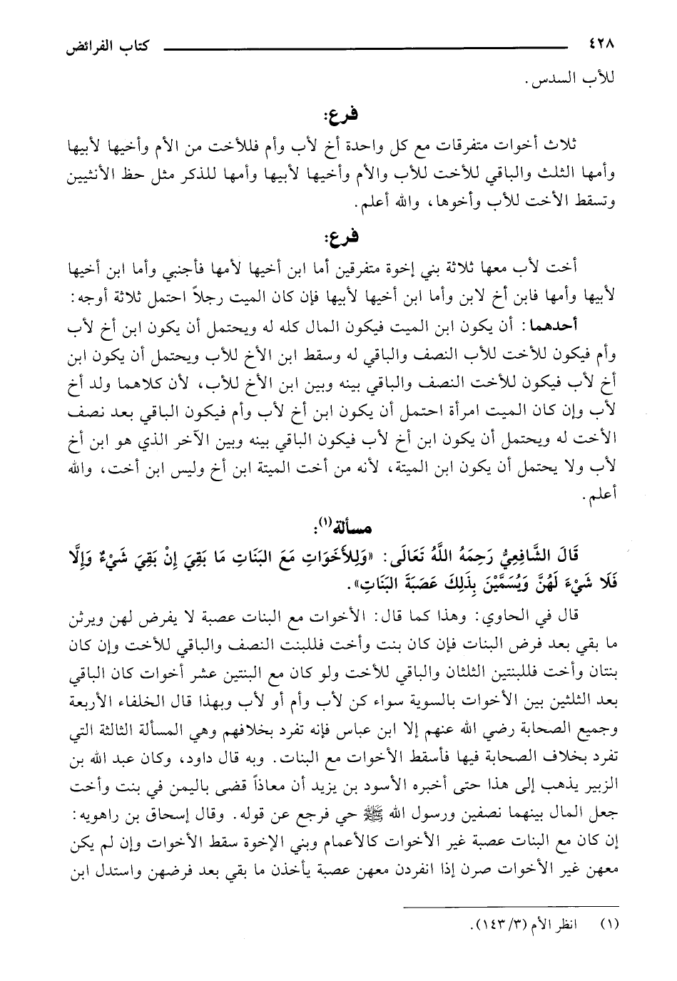 قال الشافعي رحمه الله تعالى: "وللأخوات مع البنات ما بقي إن بقي شيء وإلا فلا شيء لهن ويسمين بذلك عصبةً البنات".