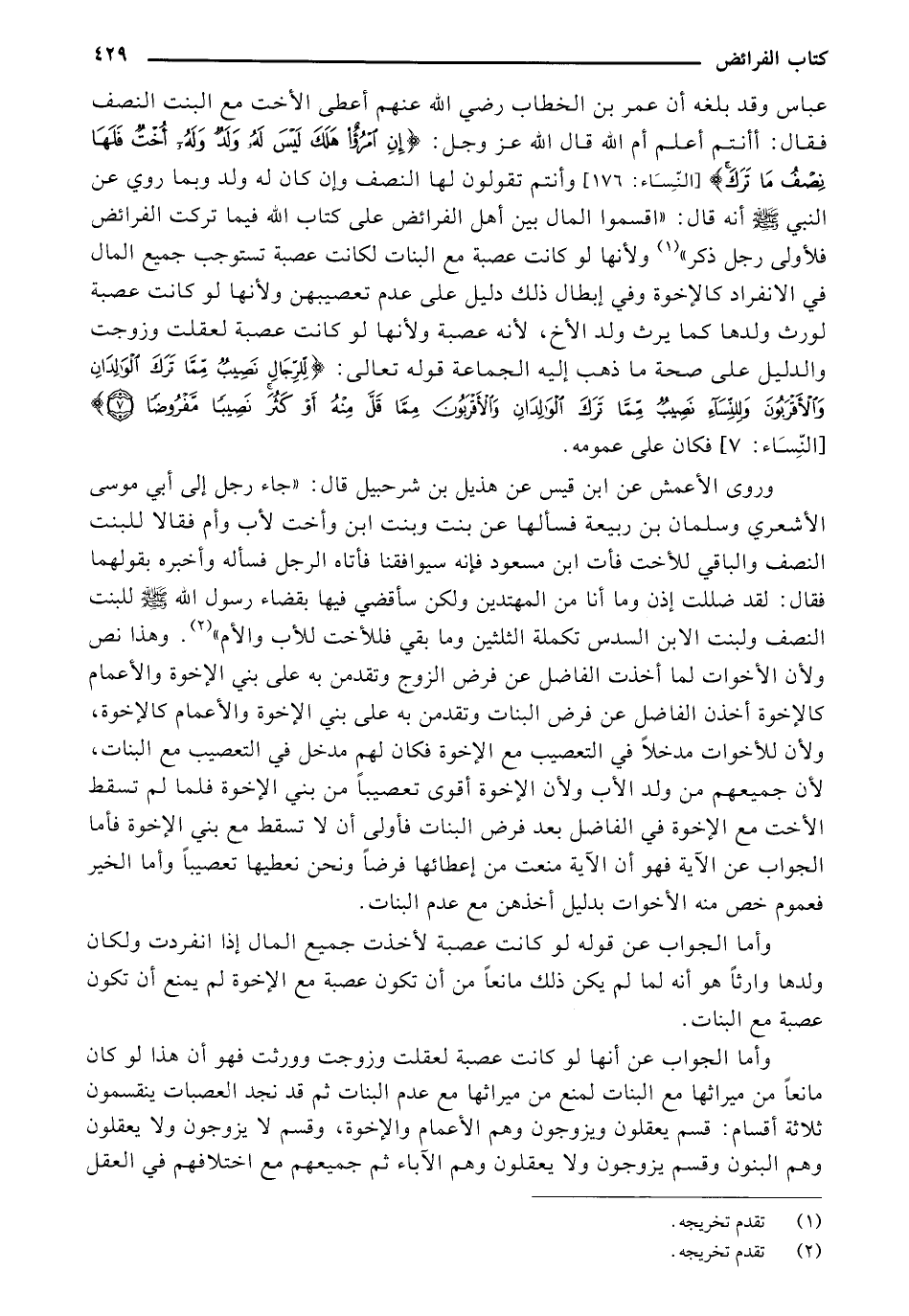 وروى الأعمش عن ابن قيس عن هذيل بن شرحبيل قال: "جاء رجل إلى أبي موسى الأشعري وسلمان بن ربيعةً فألها عن بنتا وبنتا ابن وأخت لأب وأم فقالا للبنت النصف والباقي للأخت فأتِ ابن مسعود فإنه سيوافقنا فأتاه الرجل فسأله وأخبره بقولهما فقال: لقد ضللت إذن وما أنا من المهتدين ولكن سأقضي فيها بقضاء رسول الله - صلى الله عليه وسلم - للبنت النصف والبت الابن السدس تكملةُ الثلثين وما يقي فللأخت للأب والأم"، وهذا نص ولأن الأخوات لما أخذت الفاضل عن فرض الزوج وتقدمن به على بني الإخوةً والأعمام كالإخوةً أخذن الفاضل عن فرض البنات وتقدمن به على بني الإخوةً والأعمام كالإخوةً، ولأن للأخوات مدخلًا في التعصيب مع الإخوةً فكان لهم مدخل في التعصيب مع البنات، لأن جميعهم من ولد الأب ولأن الإخوة أقوى تعصيبًا من بني الإخوةً فلما لم تسقط الأخت مع الإخوةَ في الفاضل بعد فرض البنات فأولى أن لا تسقط مع بني الإخوةً فأما الجواب عن الآيةً فهو أن الآيةَ منعت من إعطائها فرع ونحن نعطيها تعصيبًا وأما الخير فعموم خص منه الأخوات بدليل أخذهن مع عدم البنات.