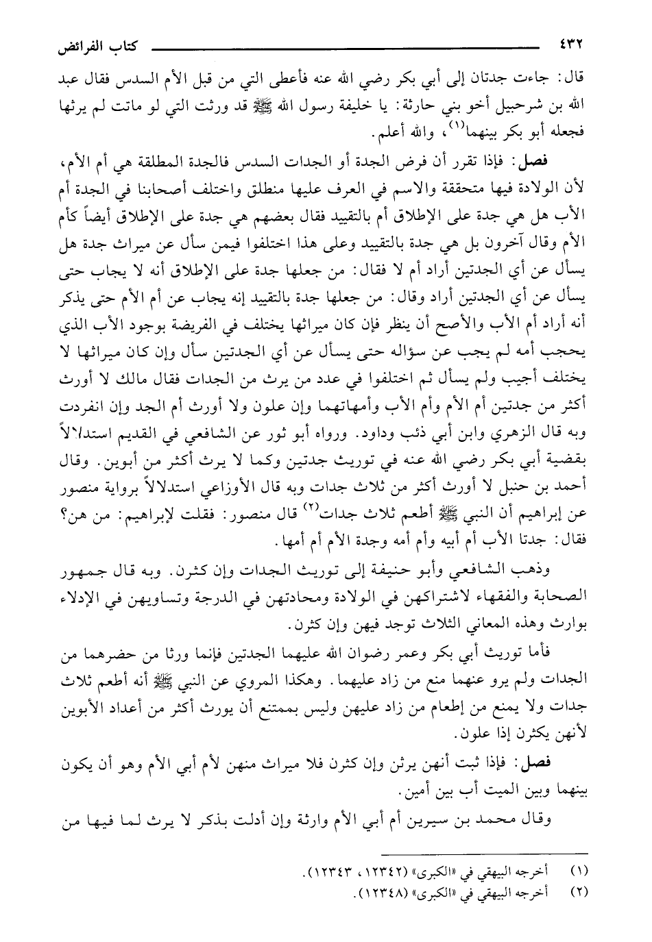 قال: جاءت جدتان إلى أبي بكر رضي الله عنه فأعطى التي من قبل الأم السدس فقال عبد الله بن شرحبيل أخو بني حارثة: يا خليفة رسول الله صلى الله عليه وسلم قد ورثت التي لو ماتت لم يرثها فجعله أبو بكر بينهما ولله أعلم.