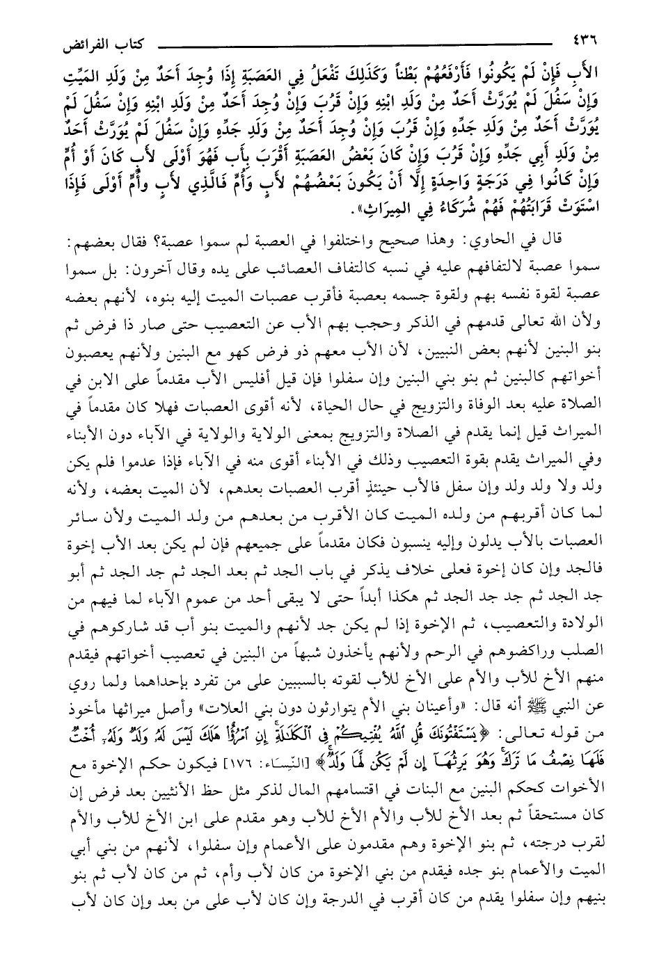 الأَبِ فَإِنْ لَمْ يَكُونُوا فَأَرْفَعُهُمْ بَطْناّ وَكَذَلِكَ تَفْعَلُ فِي العَصَبِة إِذَا وَجِدَ أَحَدٌ مِنْ وَلَدِ المَيَّتِ وَإِنْ سَفُلَ لَمْ يُوَرَّثْ أَحَدٌ مِنْ وَلَدِ ابْنِهِ وَإِنْ وُجِدَ أَحَدٌ مِنْ وَلَدِ ابِنِهِ وَإِنْ سَفُلَ لَمْ يُوِرَّثْ أَحَدٌ مِنْ وَلَدِ جَدَّهِ وَإِنْ قَرُبَ وَإِنْ وُجِدَ أَحَدٌ مِنْ وَلَدِ جَدَّهِ وَإِنْ سَفُلَ لَمْ يُوِرِثْ أَحَدٌ مِنْ وَلَدِ لأَبِي جَدَّهِ وَإِنْ قَرُبَ وَإنْ كَانَ بَعْضُ العَصَبَةِ أَقْرَبَ بأَن فَهُوَ أَوْلَى لأَب كَانَ أَوْ أُوْ أُمَّ وَإِنْ كَامُوا فِي دَرَجَةٍ وَاحِدةٍ إِلاَّ أَنْ يَكُومَ بَعْضُهُمْ لأَبٍ وَأُمَّ فَالَّذي لأبٍ وأمِّ أَوْلَى فَإذَا اسْتَوَتْ قَرَابَتُهُمْ فَهُمْ شُرَكَاءُ فِي المِيرَاثِ".