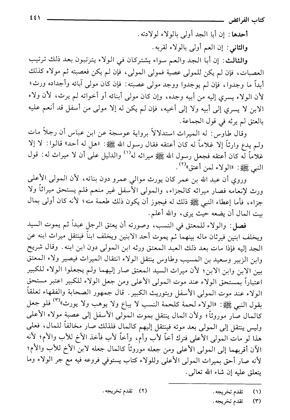 والثالث: إن أبا الجد والعم سواء يشتركان في الولاء يترتبون بعد ذلك ترتيب العصبات، فإن لم يكن للمولى عصبة فمولى المولى، فإن لم يكن فعصبته ثم مولاه كذلك أبداً ما وجدوا، فإن لم يوجدوا ووجد مولى عصبته: فإن كان مولى آبائه وأجداده ورص، لأن الولاء يسري إليه من أبيه وجده، وإن كان مولى أبنائه أو أخواته لم يرث، لأن ولاء الابن لا يسري إلى أبيه ولا إلى أخيه، فإن لم يكن له إلا مولى من أسفل قد أنعم عليه بالعتق لم يرثه في قول الجماعة.