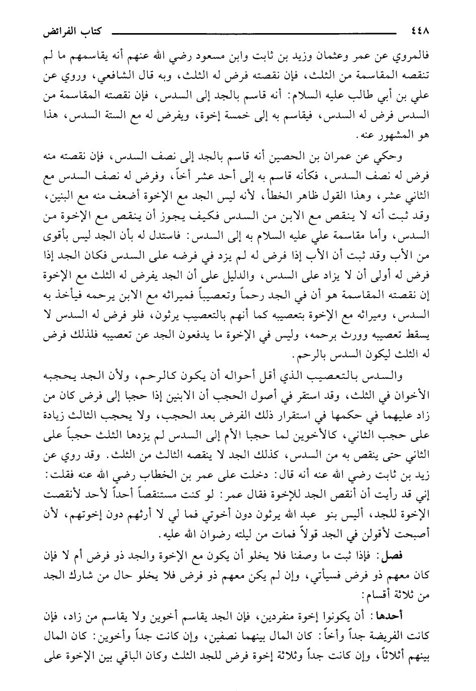 والسدس بالتعصيب الذي أقل أحواله أن يكون كالرحم، ولأن الجد يحجبه الأخوان في الثلث، وقد استقر في أصول الحجب أن الابنين إذا حجبا إلى فرض كان من زاد عليهما في حكمها في استقرار ذلك الفرض بعد الحجب، ولا يحجب الثالث زيادة على حجب الثاني، كالأخوين لما حجبا الأم إلى السدس لم يزدها الثلث حجباً على الثاني حتى ينقص به من السدس، كذلك الجد لا ينقصه الثالث من الثلث. وقد روي عن زيد بن ثابت رضي الله عنه أنه قال: دخلت على عمر بن الخطاب رضي الله عنه فقلت: إني قد رأيت أن أنقص الجد للإخوة فقال عمر: لو كنت مستنقصاً أحداً لأحد لأنقصت الإخوة للجد، أليس بنو عبد الله يرثون دون أخوتي فما لي لا أرثهم دون أخوتهم، لأن أصبحت لأقولن في الجد قولاً فمات من ليلته رضوان الله عليه.