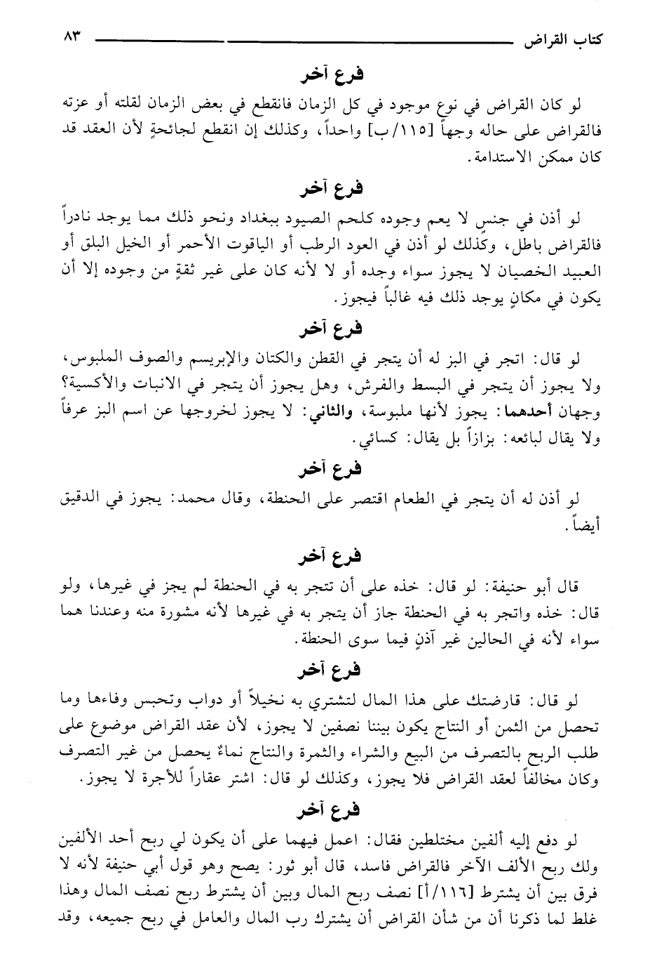 قال أبو حنيفة: لو قال: خذه على أن تنجر به في الحنطة لم يجز في غيرها، ولو قال: خذه والجر به في الحنطة جاز أن يتجر به في غيرها لأنه مشورة منه وعندنا هما سواء لأنه في الحالين غير آذٍن فيما سوى الحنطة.