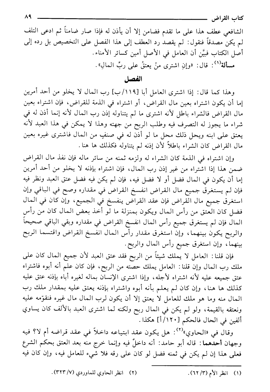وقال في "الحاوي": هل يكون عقد ابتياعه داخلة في عقد قراضه أم لا؟ فيه وجهان أحدهما: قاله أبو حامد: أنه داخلٌ فيه وإنما خرج منه بعد العنق بحكم الشرع فعلى هذا إن لم يكن في ثمنه فضل لو كان على رقه فلا شيء للعامل فيه، وإن كان فيه
