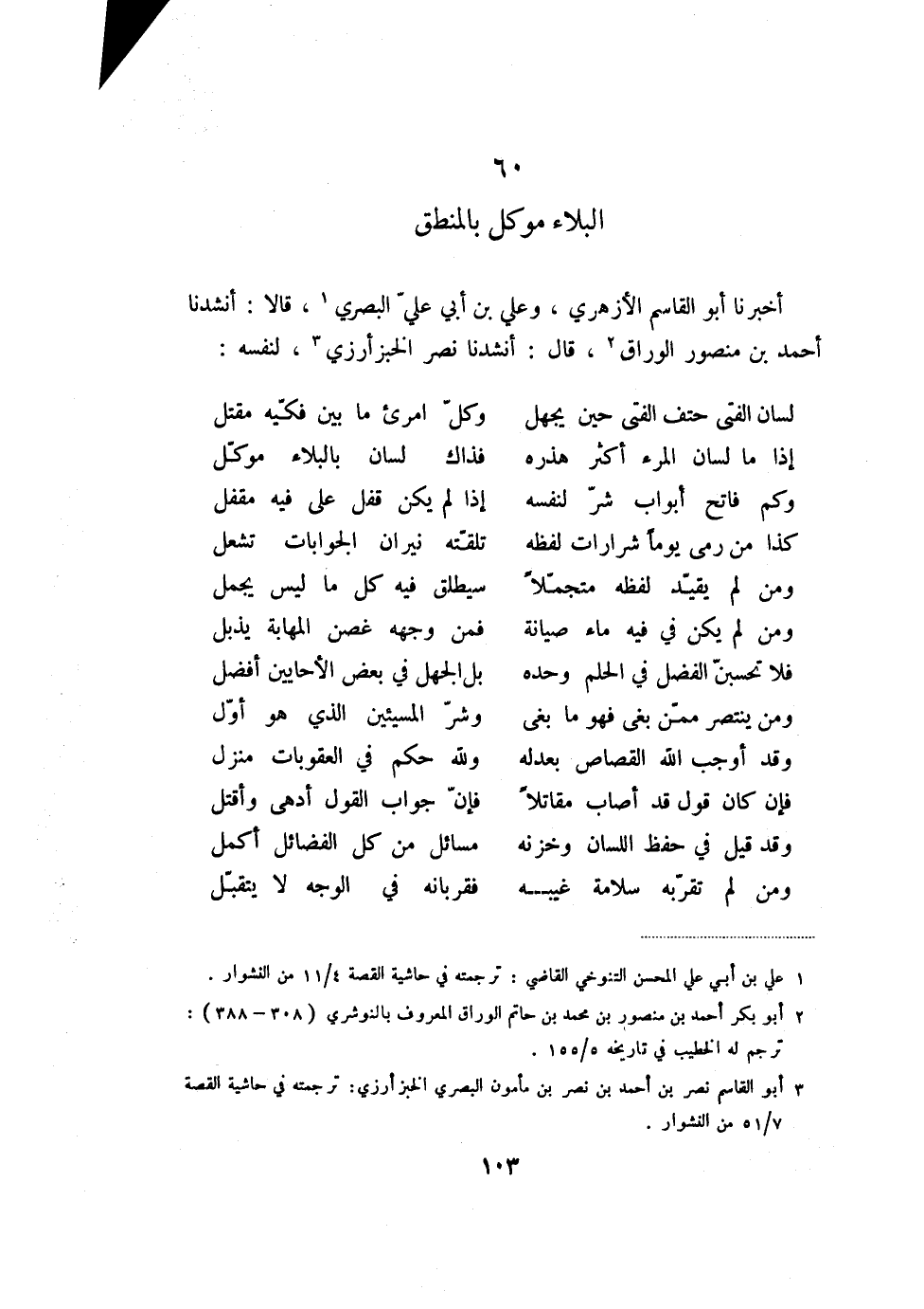 أخبرنا أبو القاسم الأزهري، وعلي بن أبي عليّ البصري «1» ، قالا: أنشدنا أحمد بن منصور الوراق «2» ، قال: أنشدنا نصر الخبزأرزي «3» ، لنفسه:
