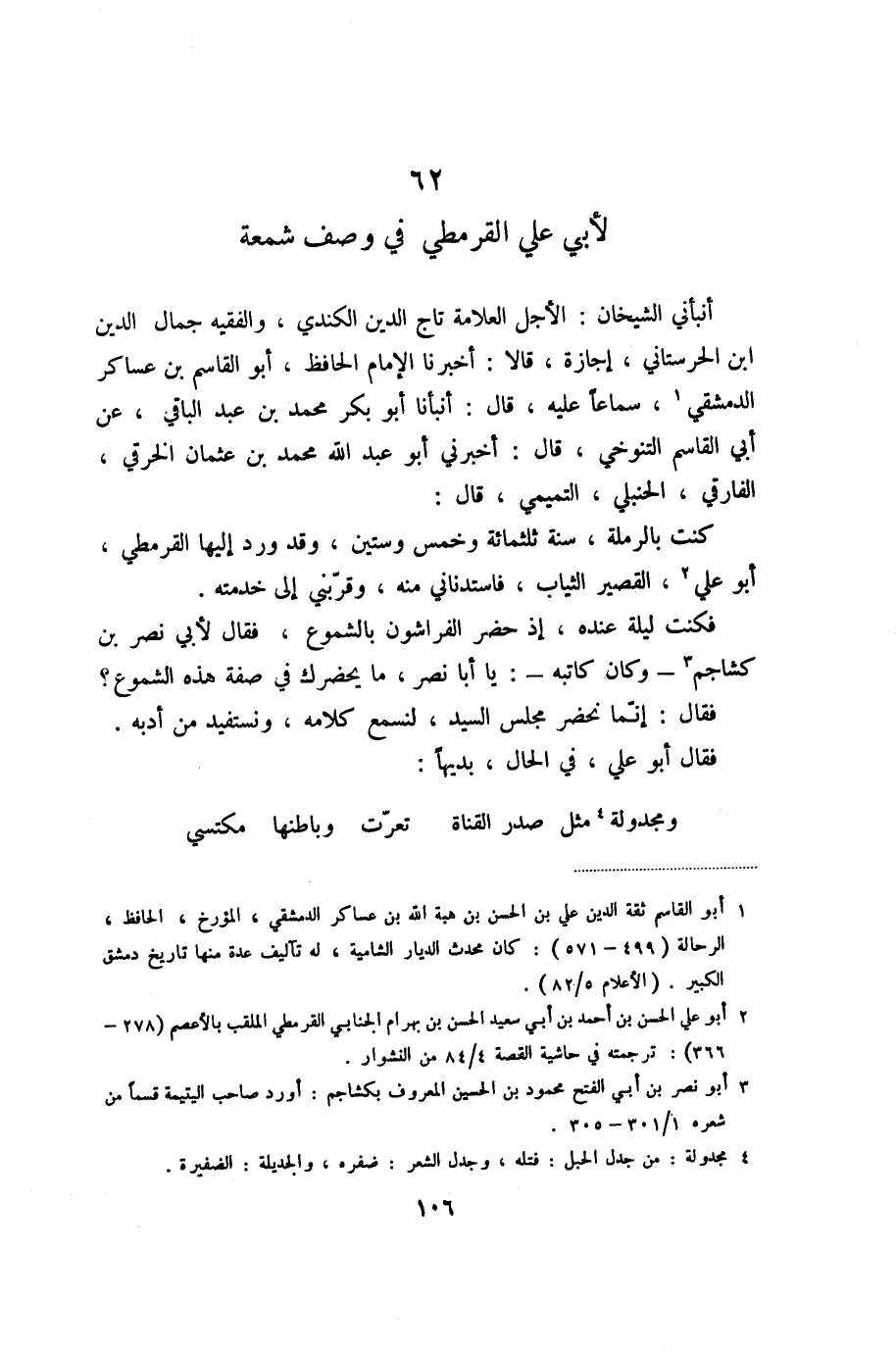 فكنت ليلة عنده، إذ حضر الفراشون بالشموع، فقال لأبي نصر بن كشاجم «3» - وكان كاتبه-: يا أبا نصر، ما يحضرك في صفة هذه الشموع؟