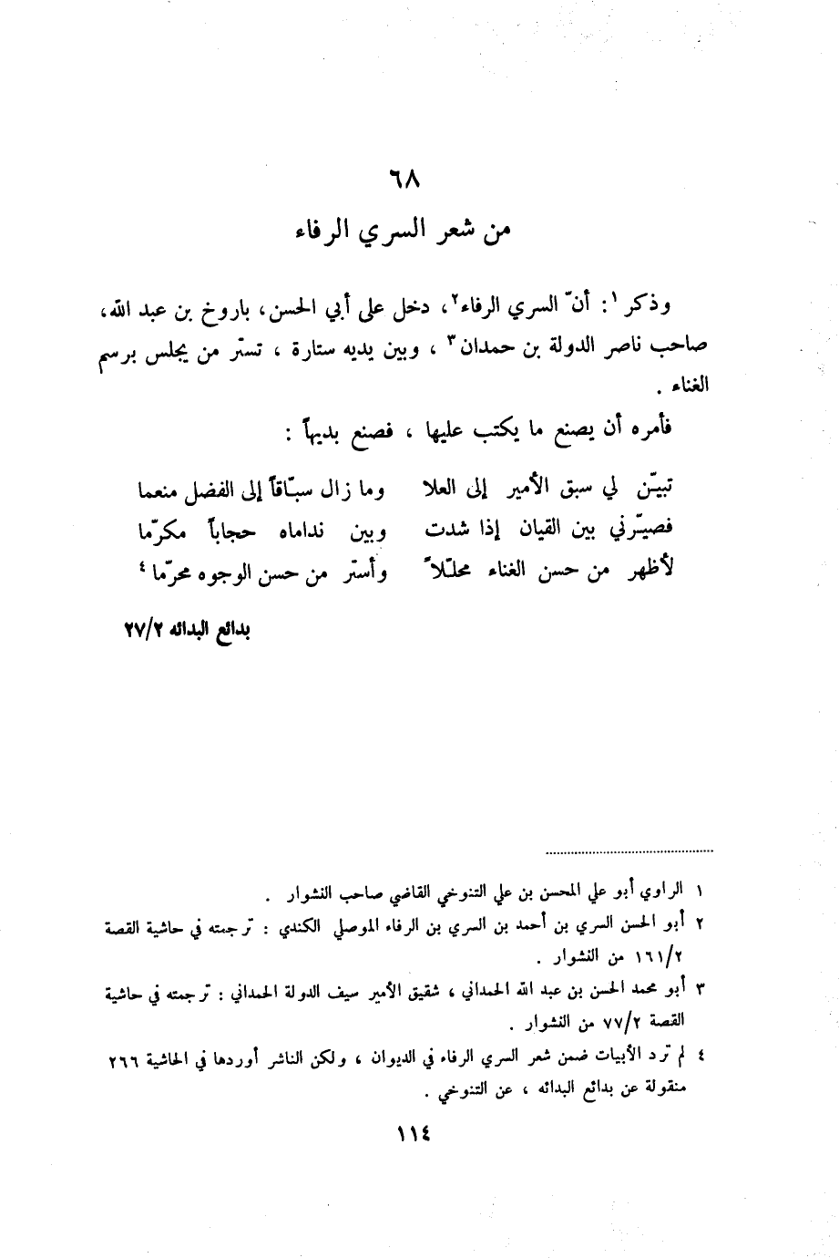 وذكر «1» : أنّ السري الرفاء «2» ، دخل على أبي الحسن، باروخ بن عبد الله، صاحب ناصر الدولة بن حمدان «3» ، وبين يديه ستارة، تستر من يجلس برسم الغناء.
