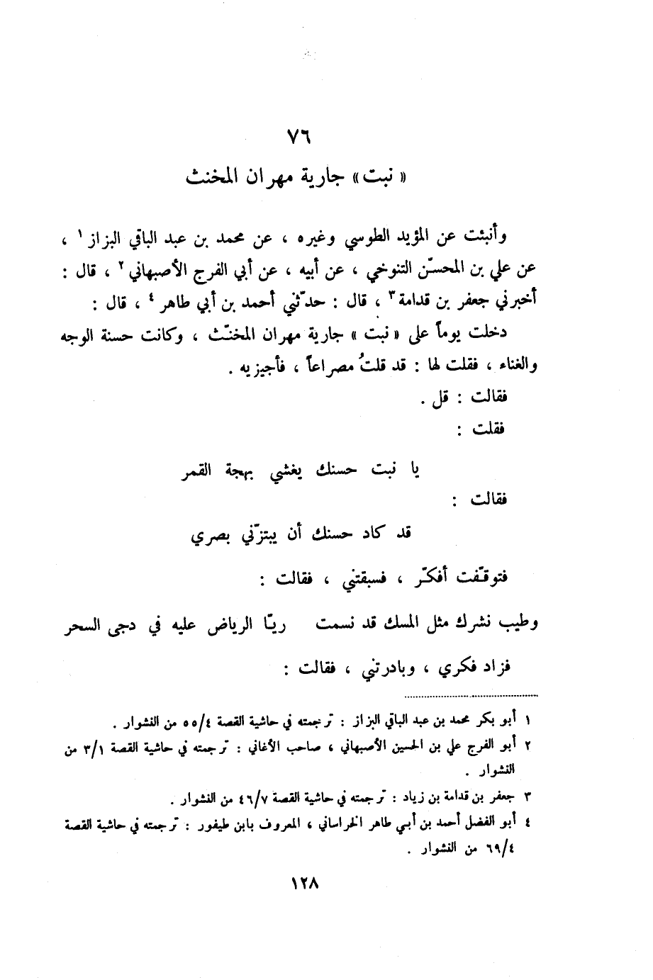 دخلت يوما على «نبت» جارية مهران المخنّث، وكانت حسنة الوجه والغناء، فقلت لها: قد قلت مصراعا، فأجيزيه.