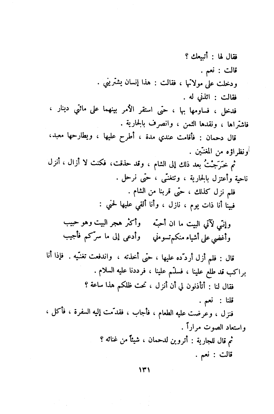 قال دحمان: فأقامت عندي مدة، أطرح عليها، ويطارحها معبد، ونظراؤه من المغنّين.