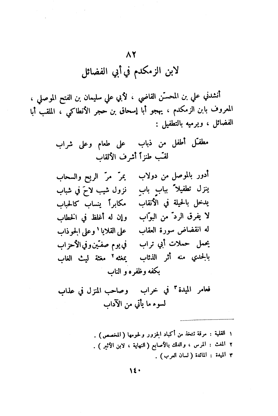 أنشدني علي بن المحسّن القاضي، لأبي علي سليمان بن الفتح الموصلي، المعروف بابن الزمكدم، يهجو أبا إسحاق بن حجر الأنطاكي، الملقب أبا الفضائل، ويرميه بالتطفيل: