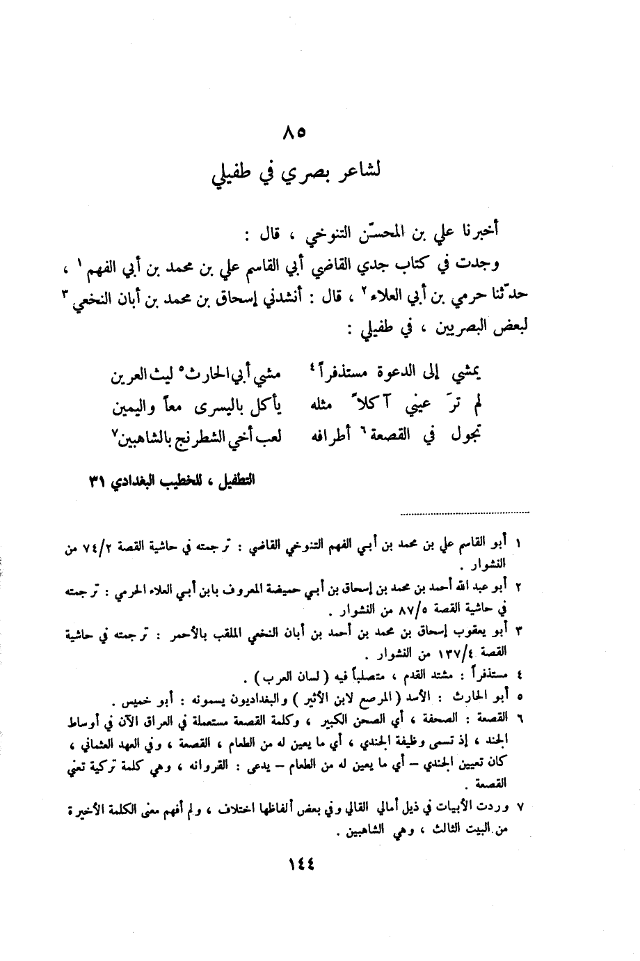 وجدت في كتاب جدي القاضي أبي القاسم علي بن محمد بن أبي الفهم «1» ، حدّثنا حرمي بن أبي العلاء «2» ، قال: أنشدني إسحاق بن محمد بن أبان النخعي «3» لبعض البصريين، في طفيلى: