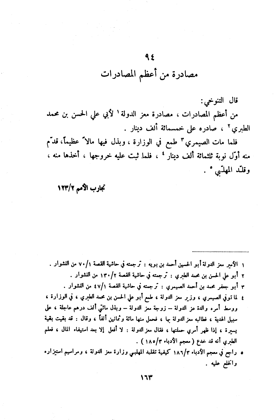 من أعظم المصادرات، مصادرة معز الدولة «1» لأبي علي الحسن بن محمد الطبري «2» ، صادره على خمسمائة ألف دينار.