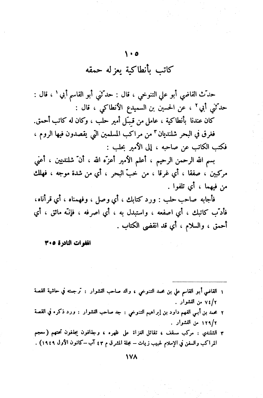 فغرق في البحر شلنديان «3» من مراكب المسلمين التي يقصدون فيها الروم، فكتب الكاتب عن صاحبه، إلى الأمير بحلب: