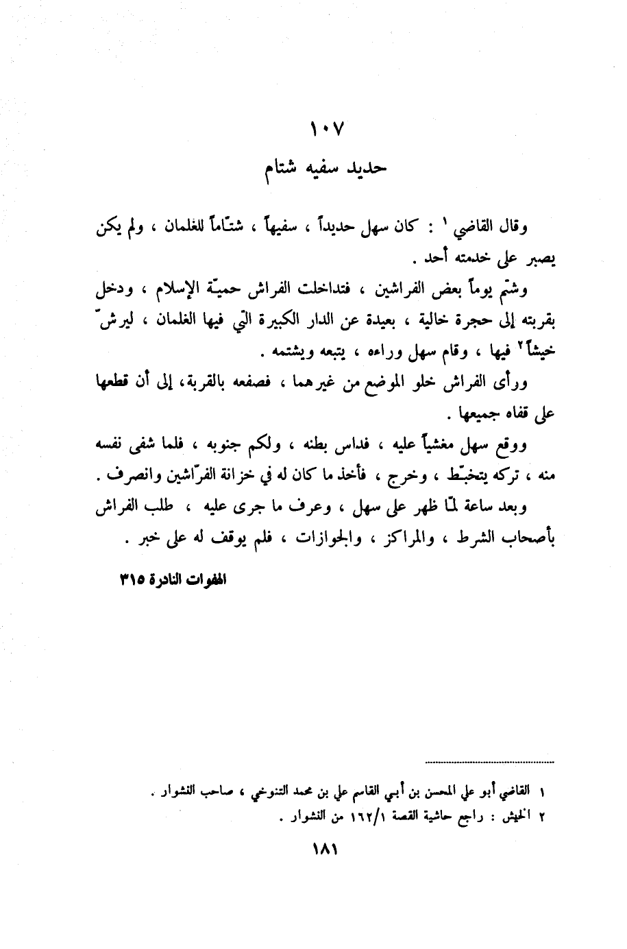 وشتم يوما بعض الفراشين، فتداخلت الفراش حميّة الإسلام، ودخل بقربته إلى حجرة خالية، بعيدة عن الدار الكبيرة التي فيها الغلمان، ليرشّ خيشا «2» فيها، وقام سهل وراءه، يتبعه ويشتمه.