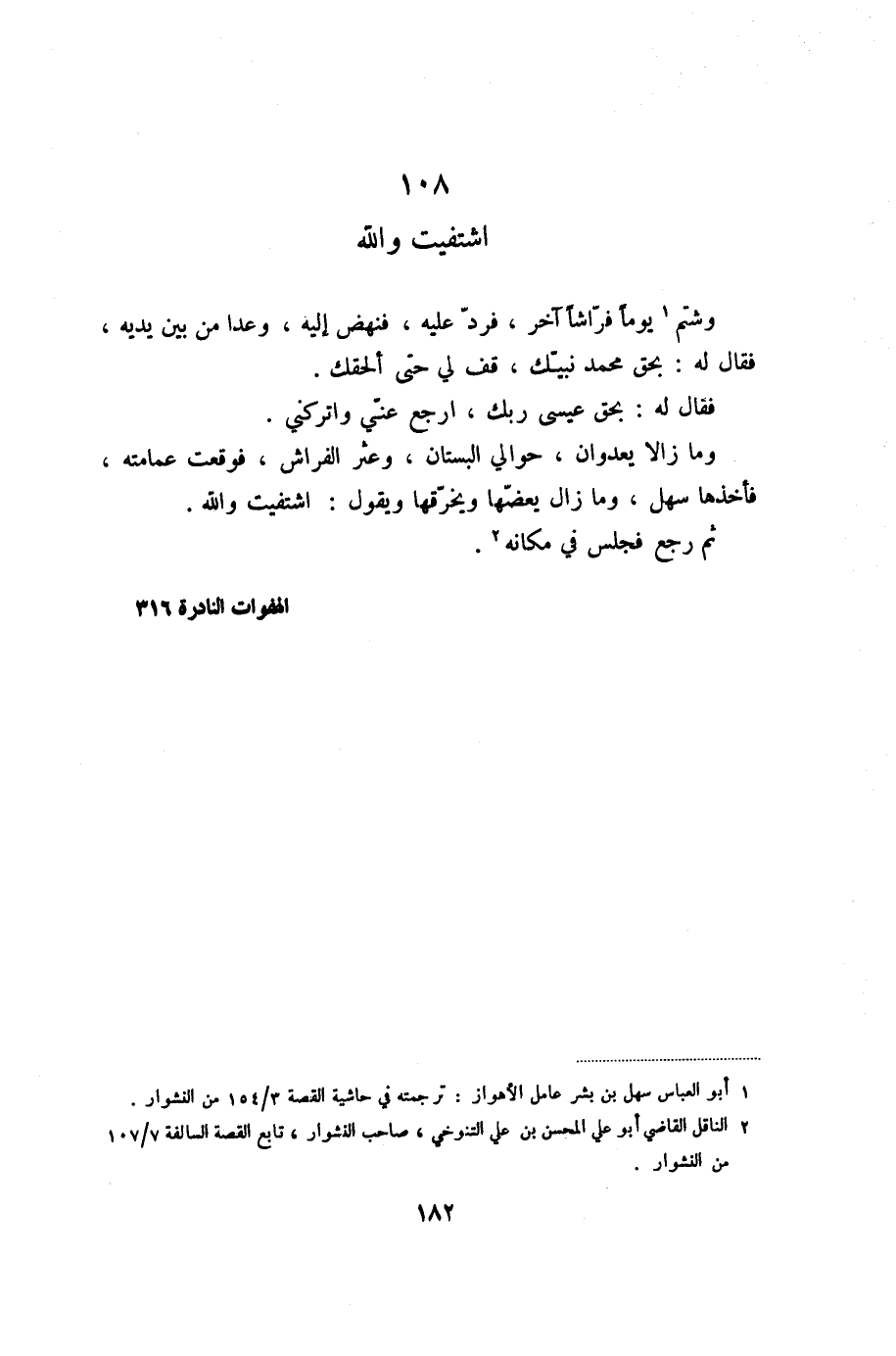 وما زالا يعدوان، حوالي البستان، وعثر الفراش، فوقعت عمامته، فأخذها سهل، وما زال يعضّها ويخرّقها ويقول: اشتفيت والله.