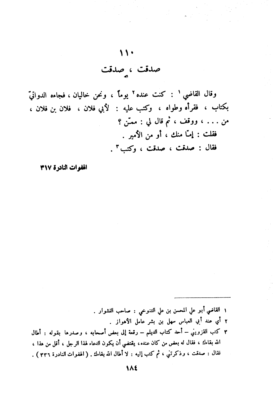 وقال القاضي «1» : كنت عنده «2» يوما، ونحن خاليان، فجاءه الدواتيّ بكتاب، فقرأه وطواه، وكتب عليه: لأبي فلان، فلان بن فلان، من ... ، ووقف، ثم قال لي: ممّن؟