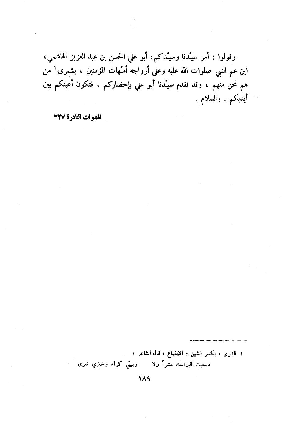 وقولوا: أمر سيّدنا وسيّدكم، أبو علي الحسن بن عبد العزيز الهاشمي، ابن عم النبي صلوات الله عليه وعلى أزواجه أمّهات المؤمنين، بشرى «1» من هم نحن منهم، وقد تقدم سيّدنا أبو علي بإحضاركم، فتكون أعينكم بين أيديكم. والسلام.