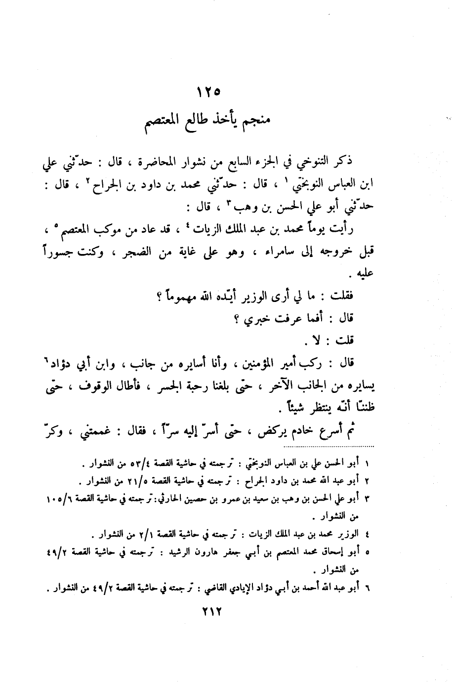 ذكر التنوخي في الجزء السابع من نشوار المحاضرة، قال: حدّثني علي ابن العباس النوبختي «1» ، قال: حدّثني محمد بن داود بن الجراح «2» ، قال: