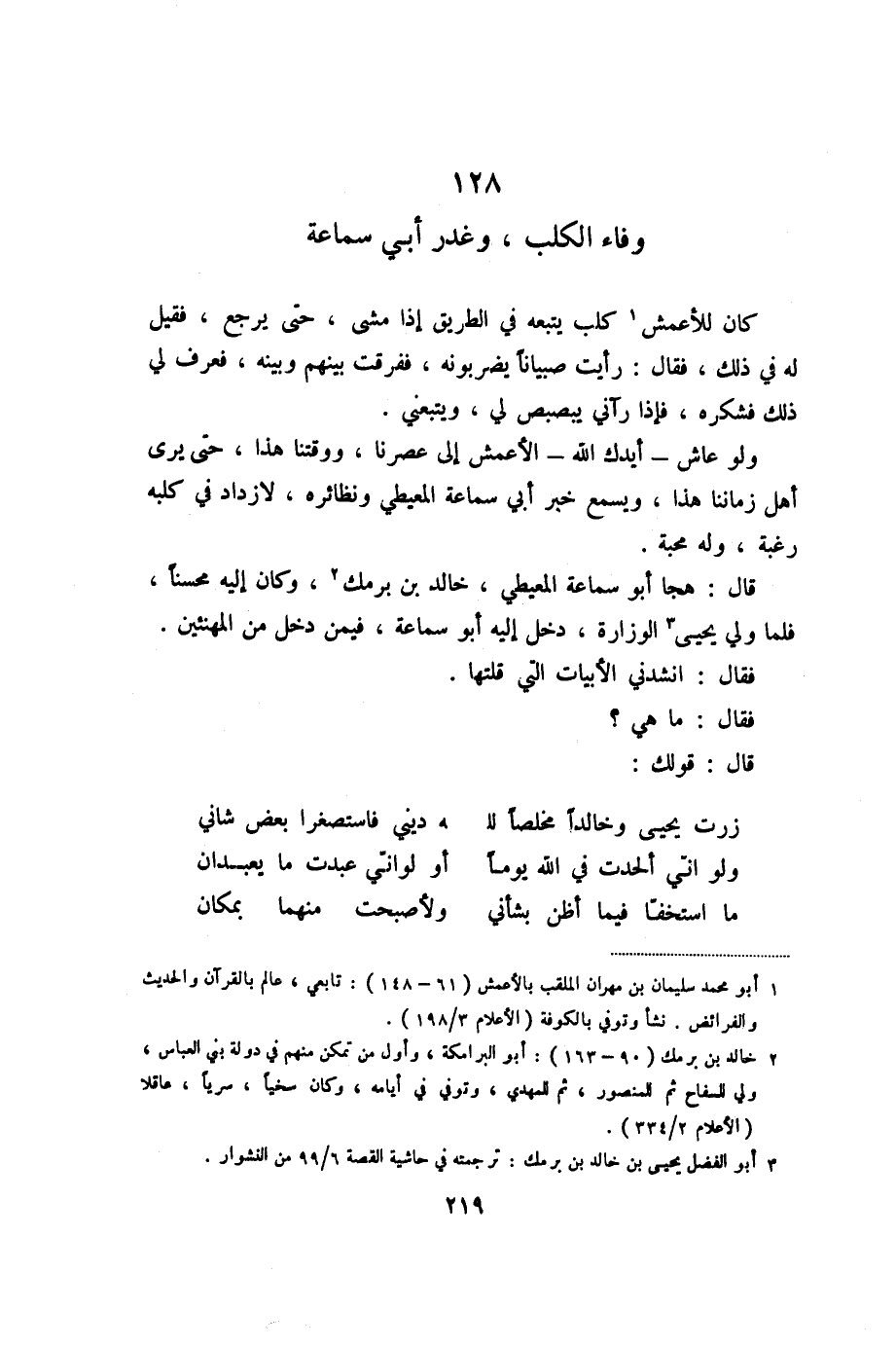 كان للأعمش «1» كلب يتبعه في الطريق إذا مشى، حتى يرجع، فقيل له في ذلك، فقال: رأيت صبيانا يضربونه، ففرقت بينهم وبينه، فعرف لي ذلك فشكره، فإذا رآني يبصبص لي، ويتبعني.