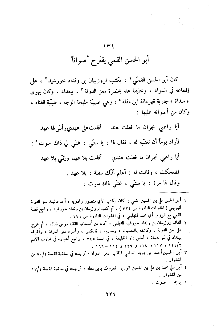 «1» كان أبو الحسن القمّي، يكتب لروزبهان بن ونداد خورشيد «2» ، على إقطاعه في السواد، وخليفة عنه بحضرة معز الدولة «3» ، ببغداد، وكان يهوى «منداة» جارية قهرمانة ابن مقلة «4» ، وهي صبيّة مليحة الوجه، طيّبة الغناء، وكان من أصواته عليها: